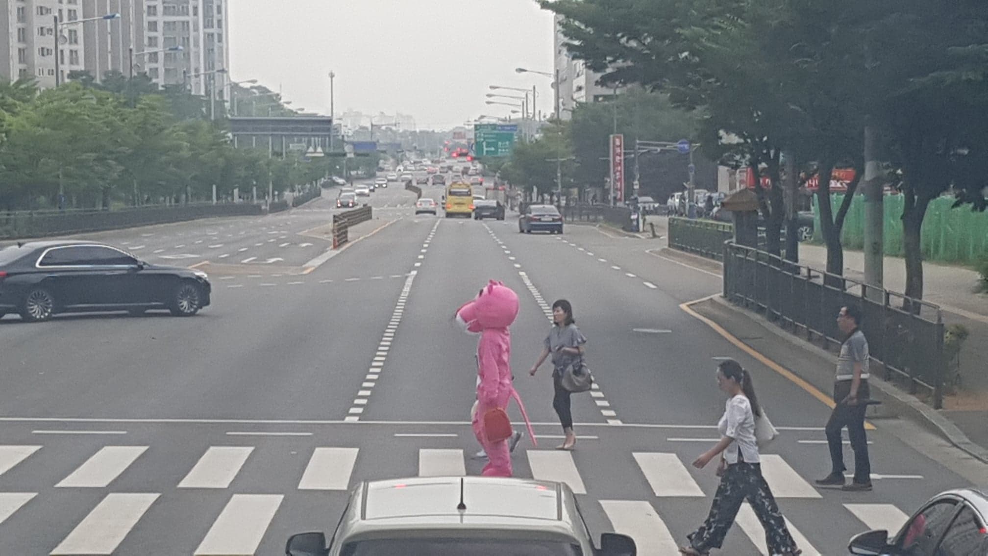 8601A 버스 2층에서 바라본 횡단보도 핑크팬더가 걸어가는데