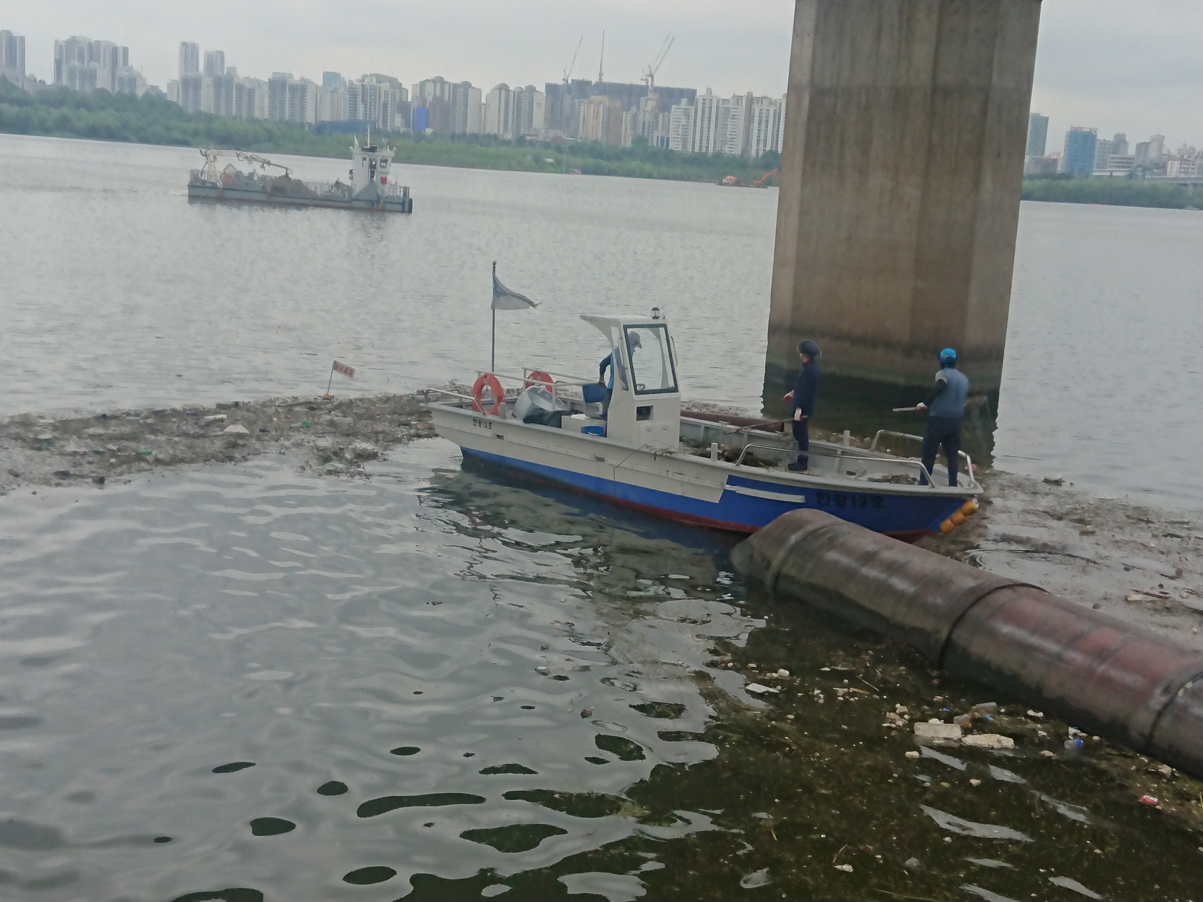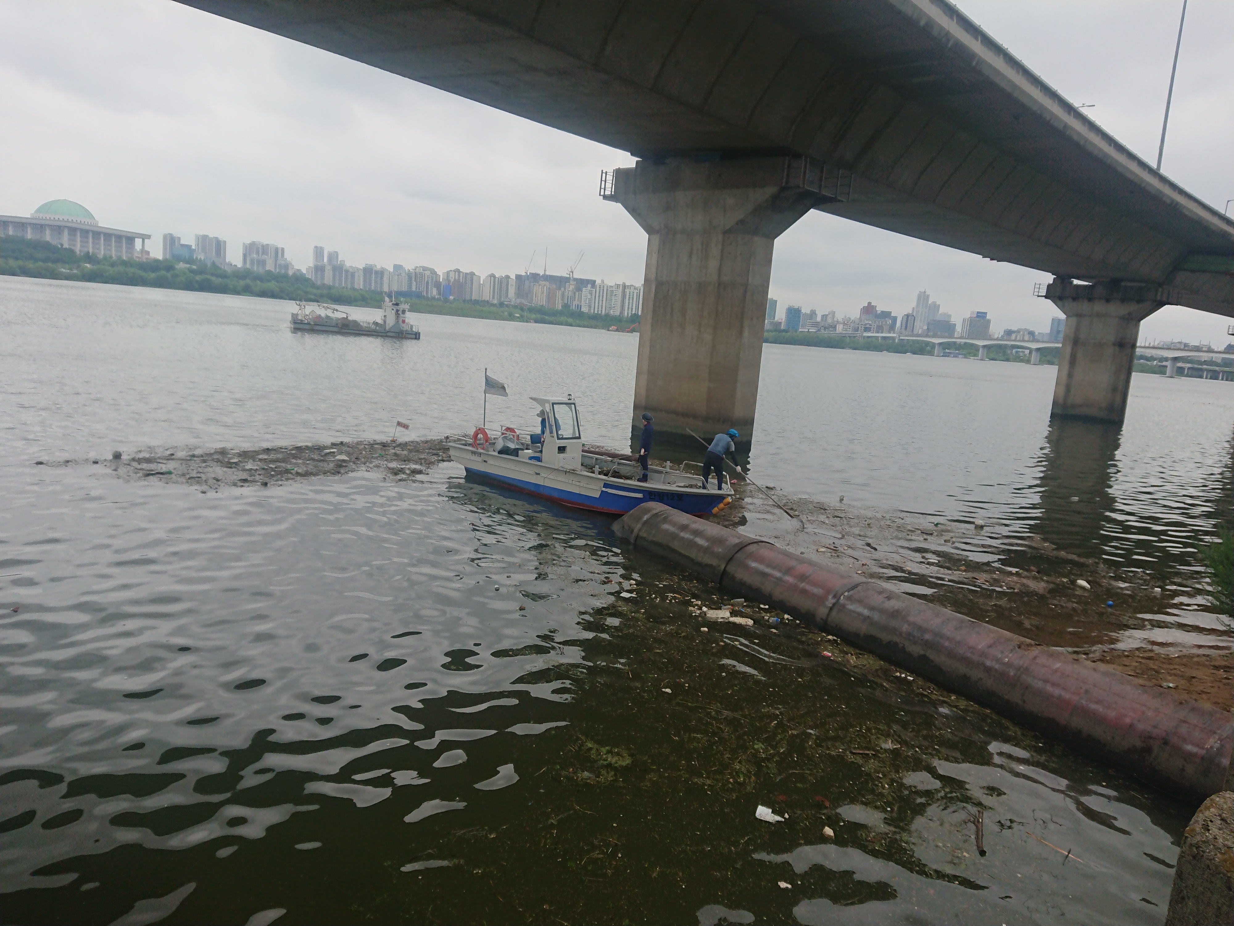 비가 몇일 뿌리고 지나더니 떠내려온 부유물들 청소가 한창이다.