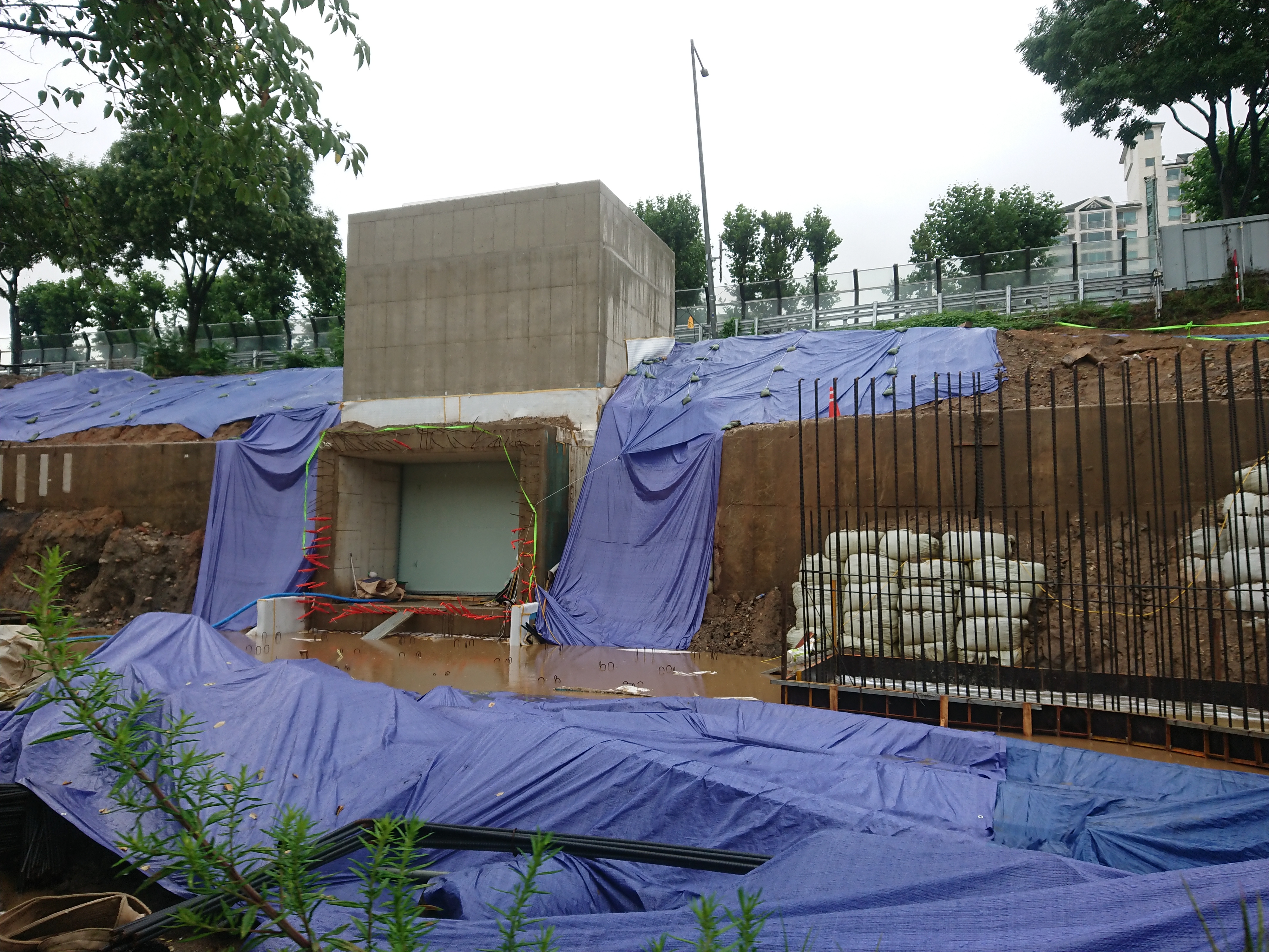 신마포 나들목 공사현장. 비가 들이쳐 물이 잔뜩 고였네.