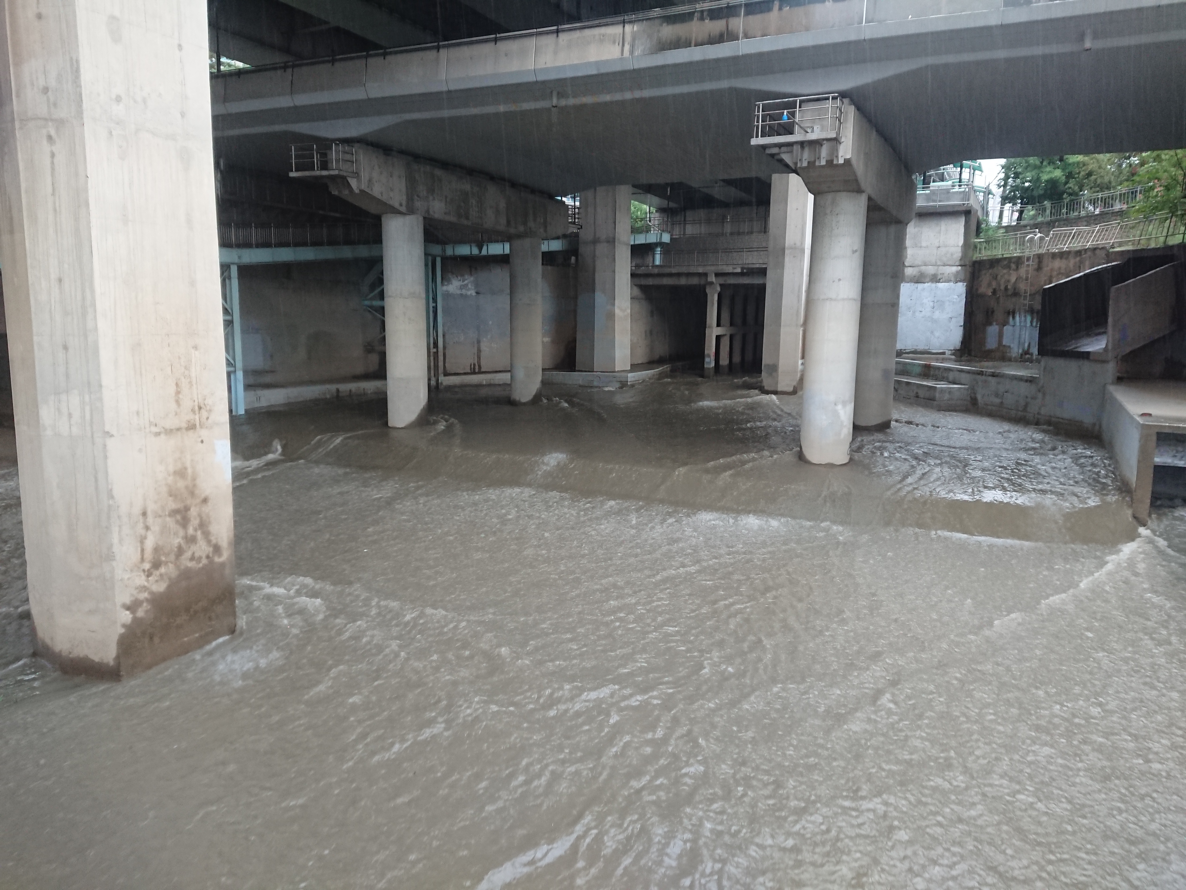 서강대교 남단 봉원천교 아래로 물이 가득하다