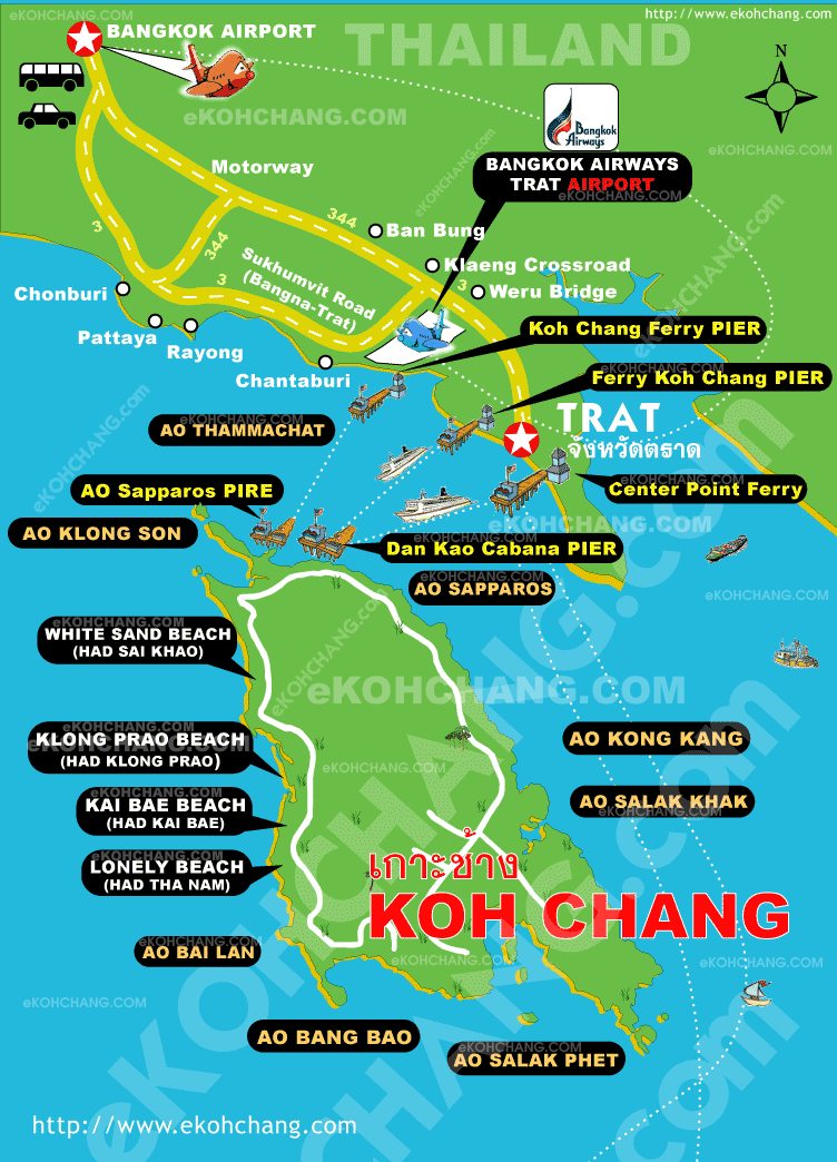 Ideally take the Government Bus 999 which runs between Ekamai Bus Station, Sukhumvit Rd, Bangkok and the ferry piers, highlighted in orange below. The ticket price is 250 Baht per person.