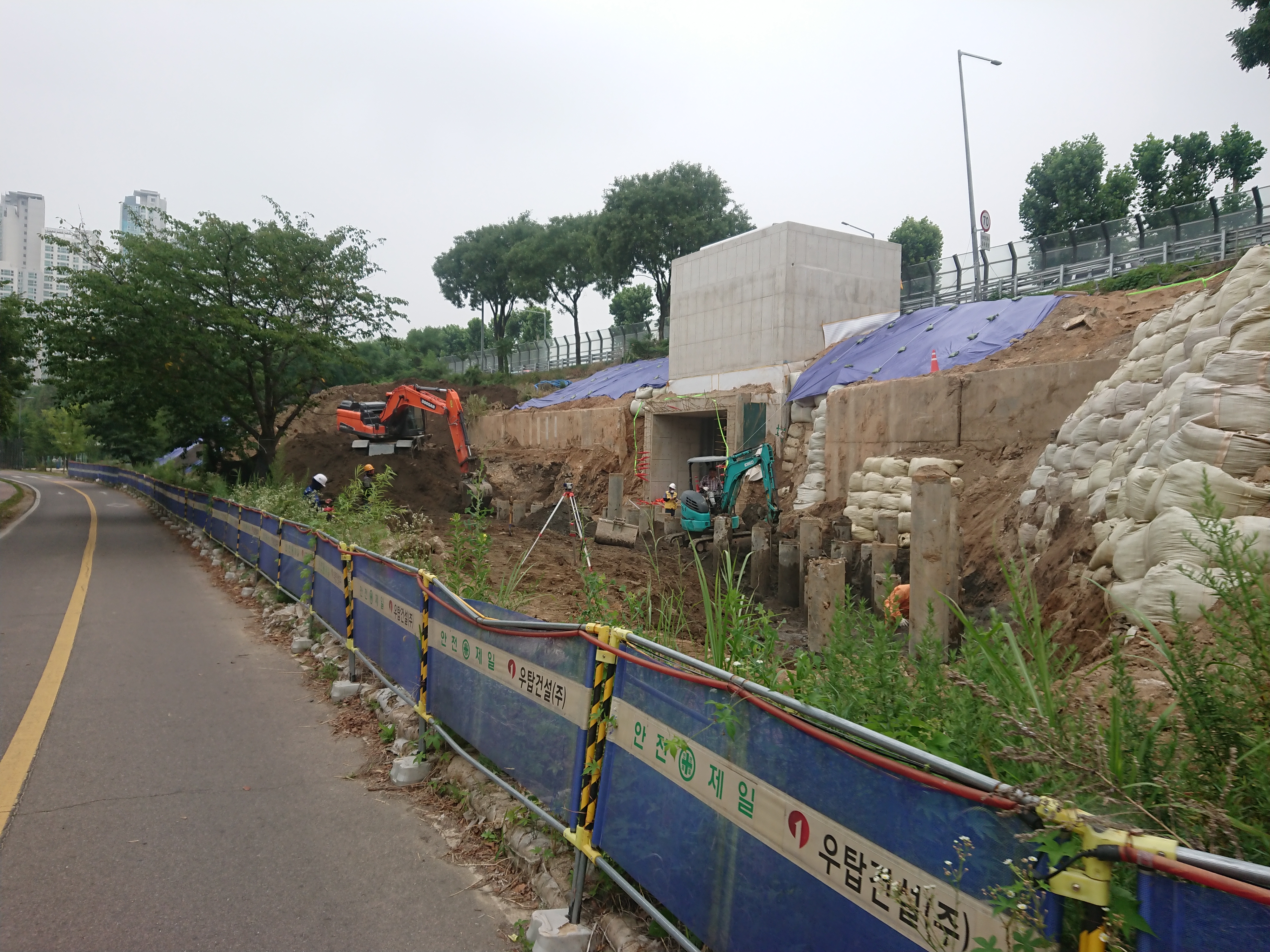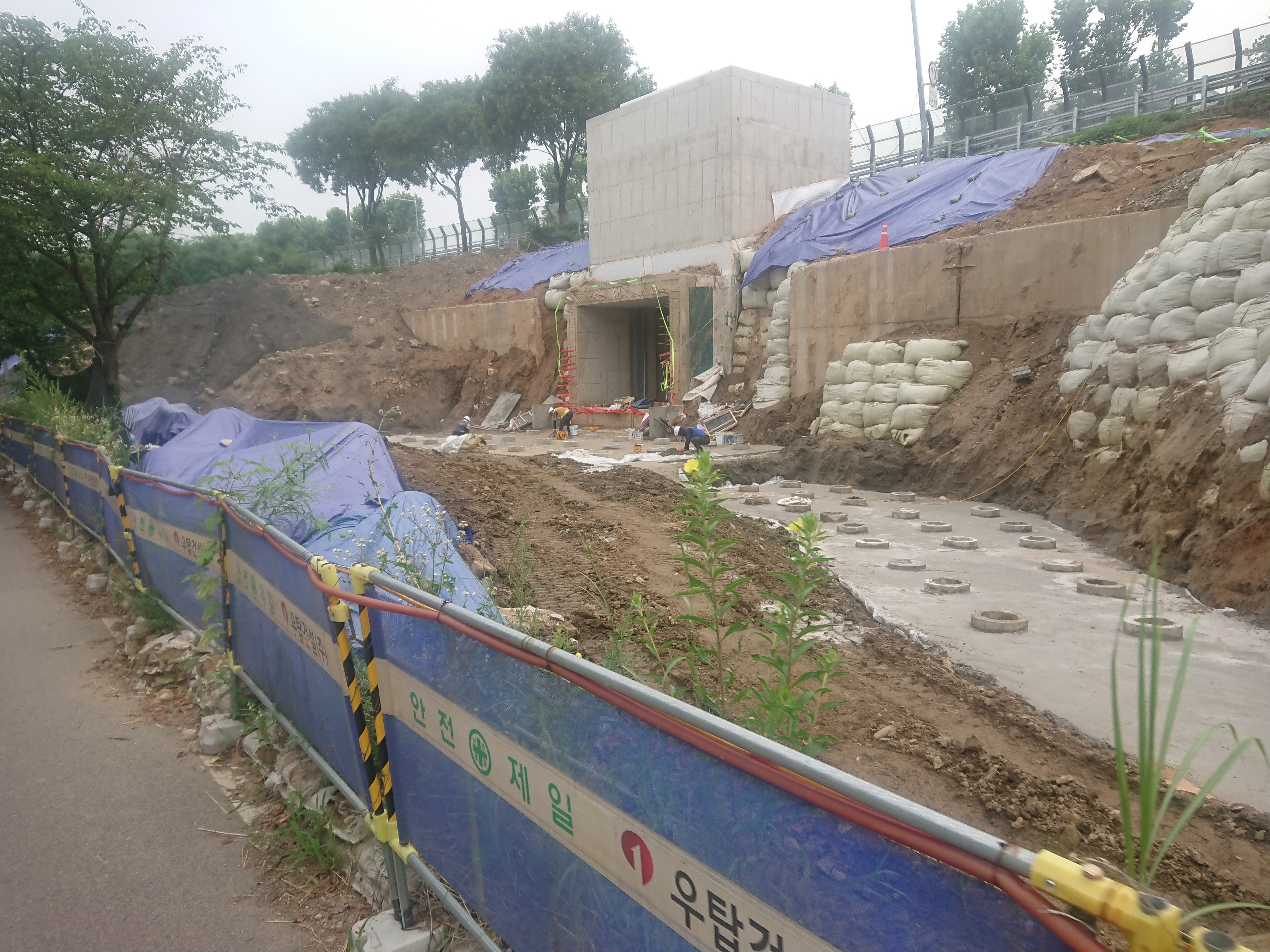 장마기간중 계속 물이 들어차 공사가 더뎌지나 했는데 .