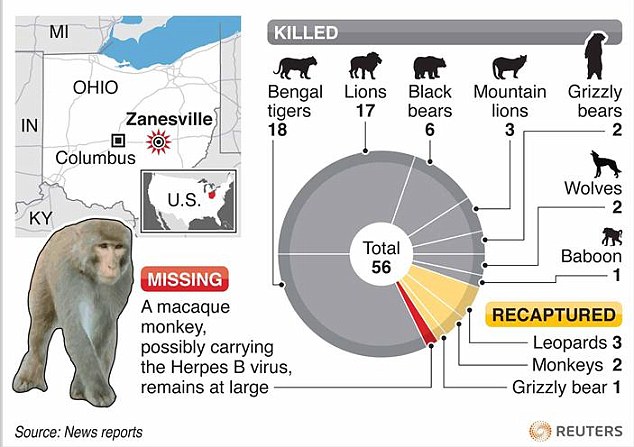 10월18일 탈출한 동물들은 대부분 살해되었고 생포되어 보호된 동물은 6마리이다. 이중 표범 한마리는 오하이오주 콜럼버스 수족관 동물병원으로 ..