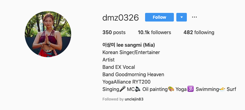 이미 lee sangmi (Mia) Korean Singer/Entertainer Artist Band EX Vocal Band Goodmorning Heaven YogaAlliance RYT200 Singing🎤 MC🔉 Oil painting🎨 Yoga🕉 Swimming🏊♂️ Surf