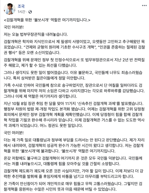 더는 제 가족 일로 대통령님과 정부에 부담을 드려서는 안 된다고 판단했습니다. 제가 자리에서 내려와야, 검찰개혁의 성공적 완수가 가능한 시간이 왔다고 생각합니다. 저는 검찰개혁을 위한 '불쏘시개'에 불과합니다. '불쏘시개' 역할은 여기까지입니다.