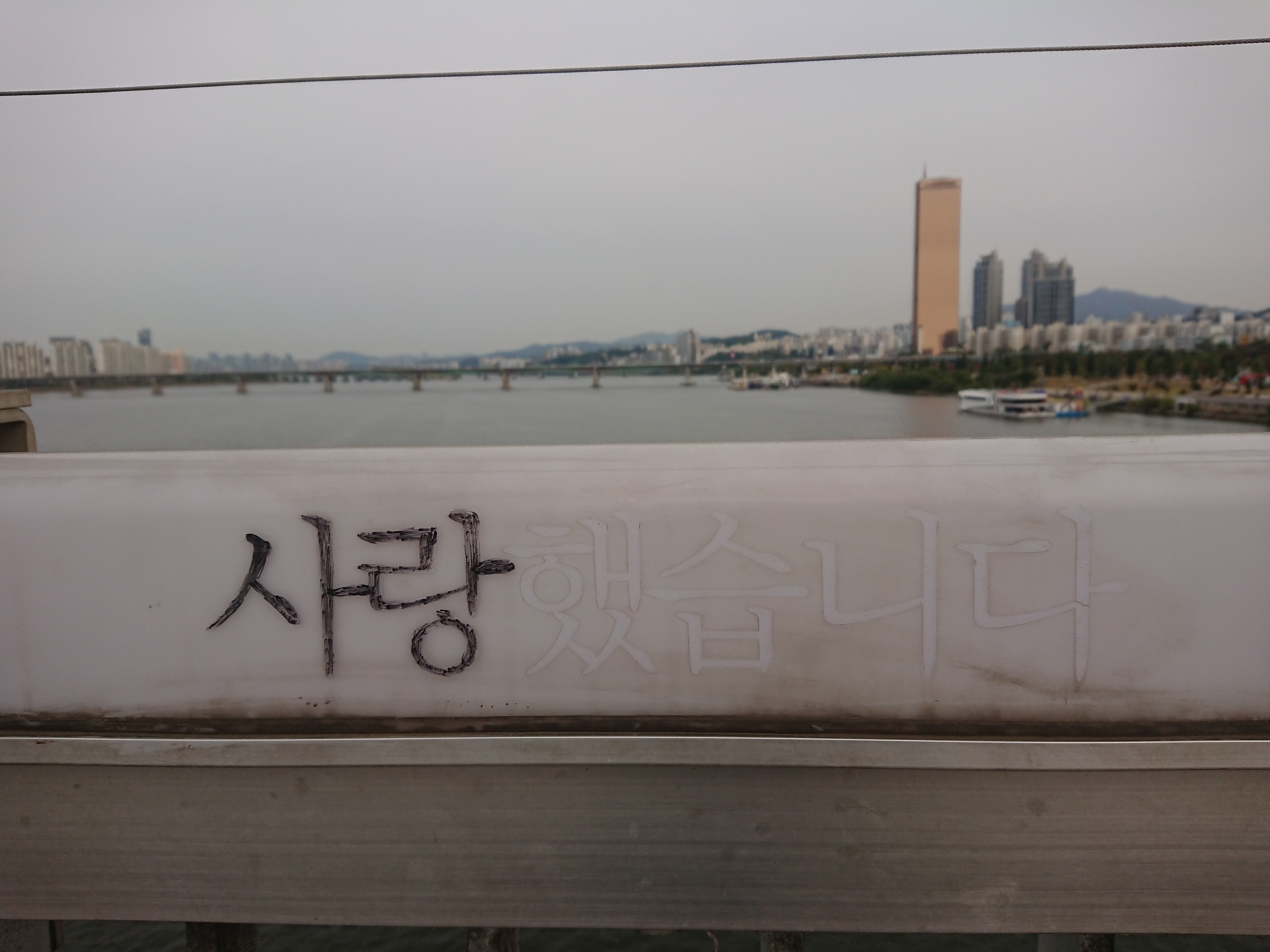 마포대교 육삼빌딩 방향에 남아있는 텍스트가 있네요. '사랑하고, 하지만. '