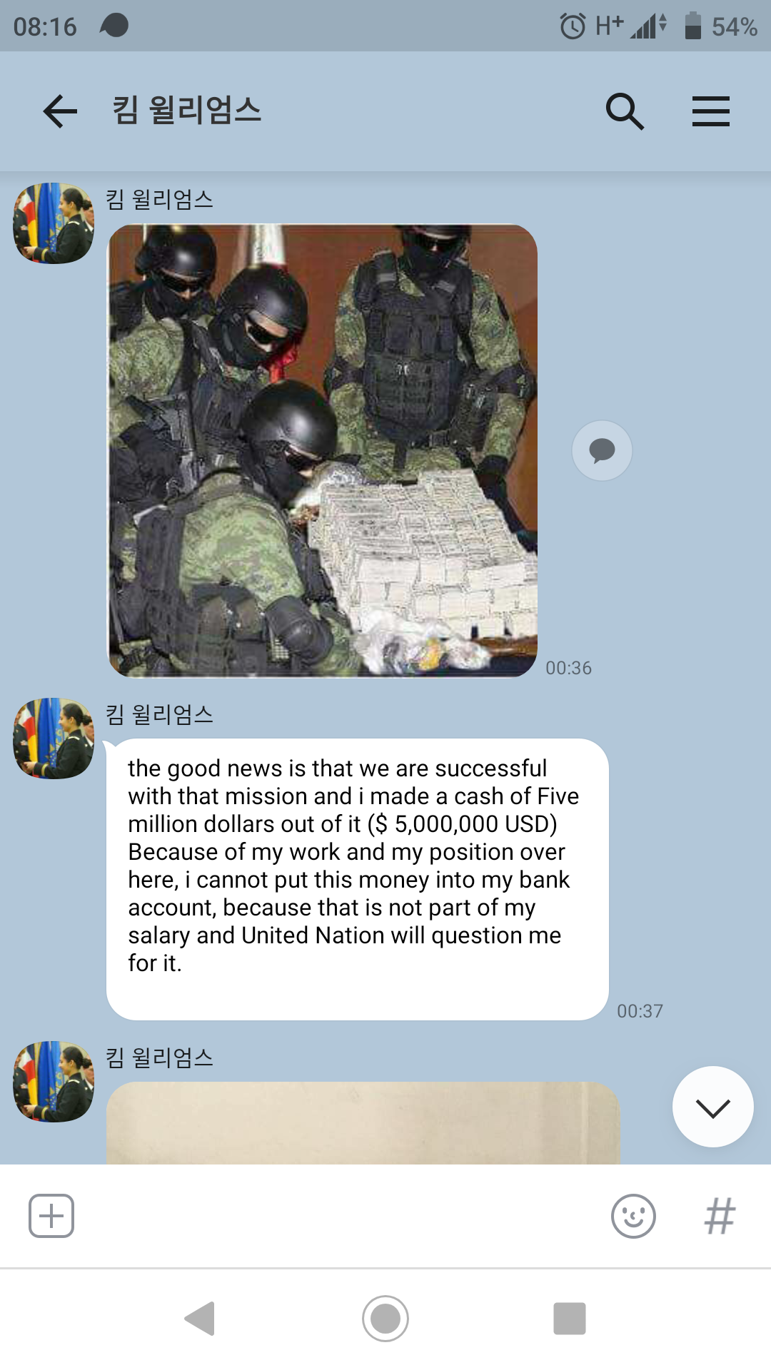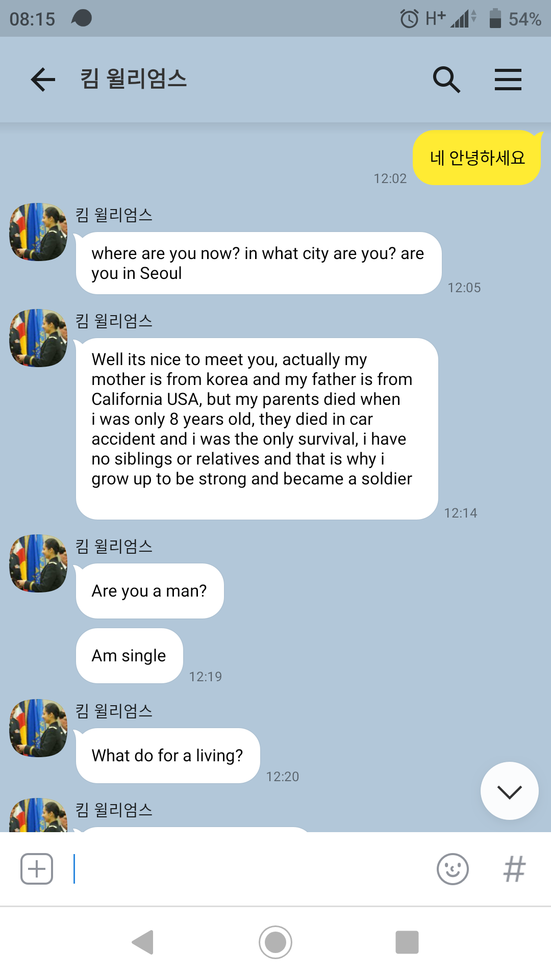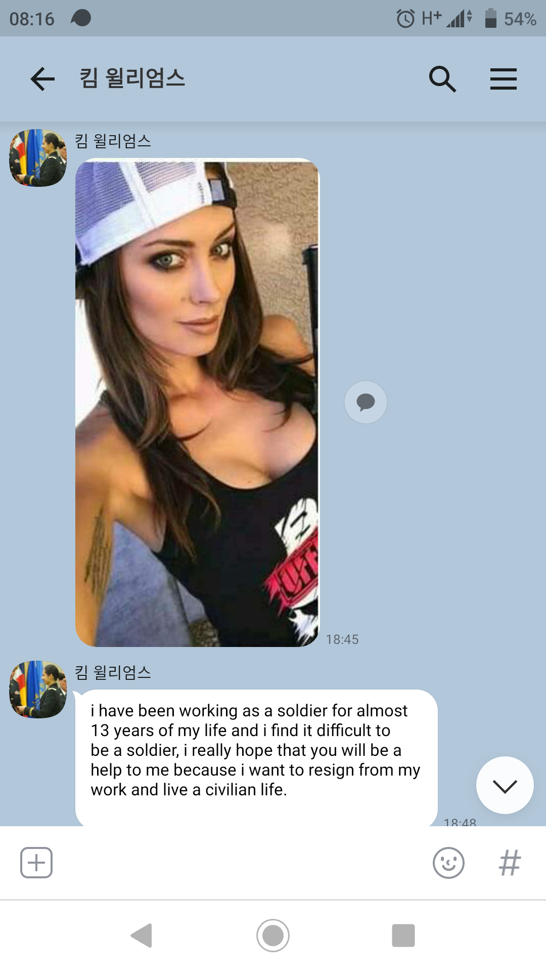 스캠많은 21세기에 오신 것을 환영합니다. 뉴스기사에서만 보던 로맨스 스캠. 저에게도 오는군요. 경로는 카카오톡. 카카오톡명은 Kim williams 카카오톡 ID : 7775kim 일단 새로운 친구가 생겼으니 대답은 해주어..