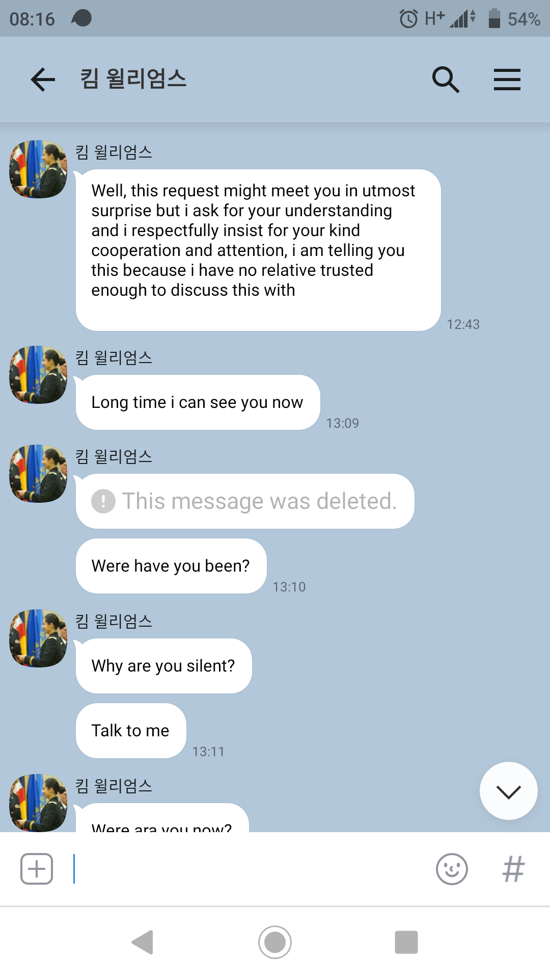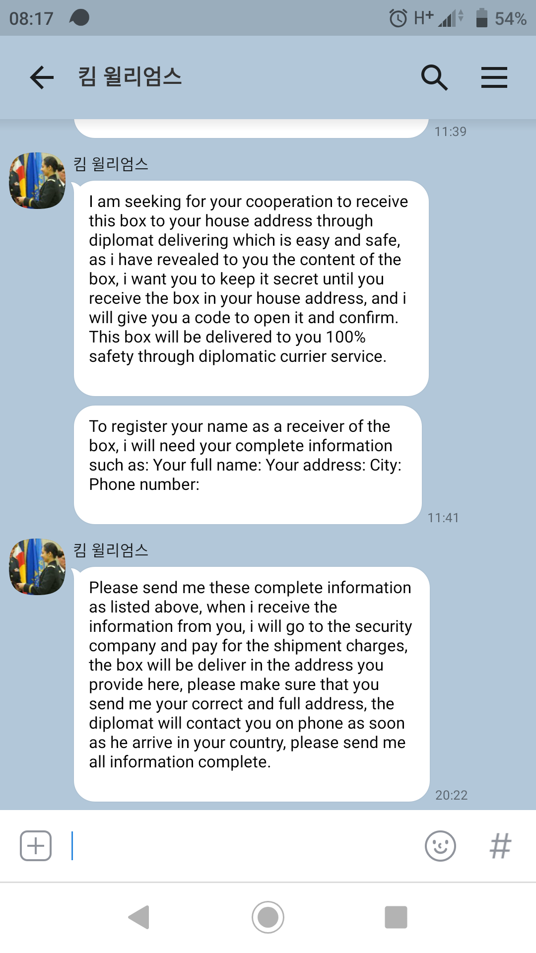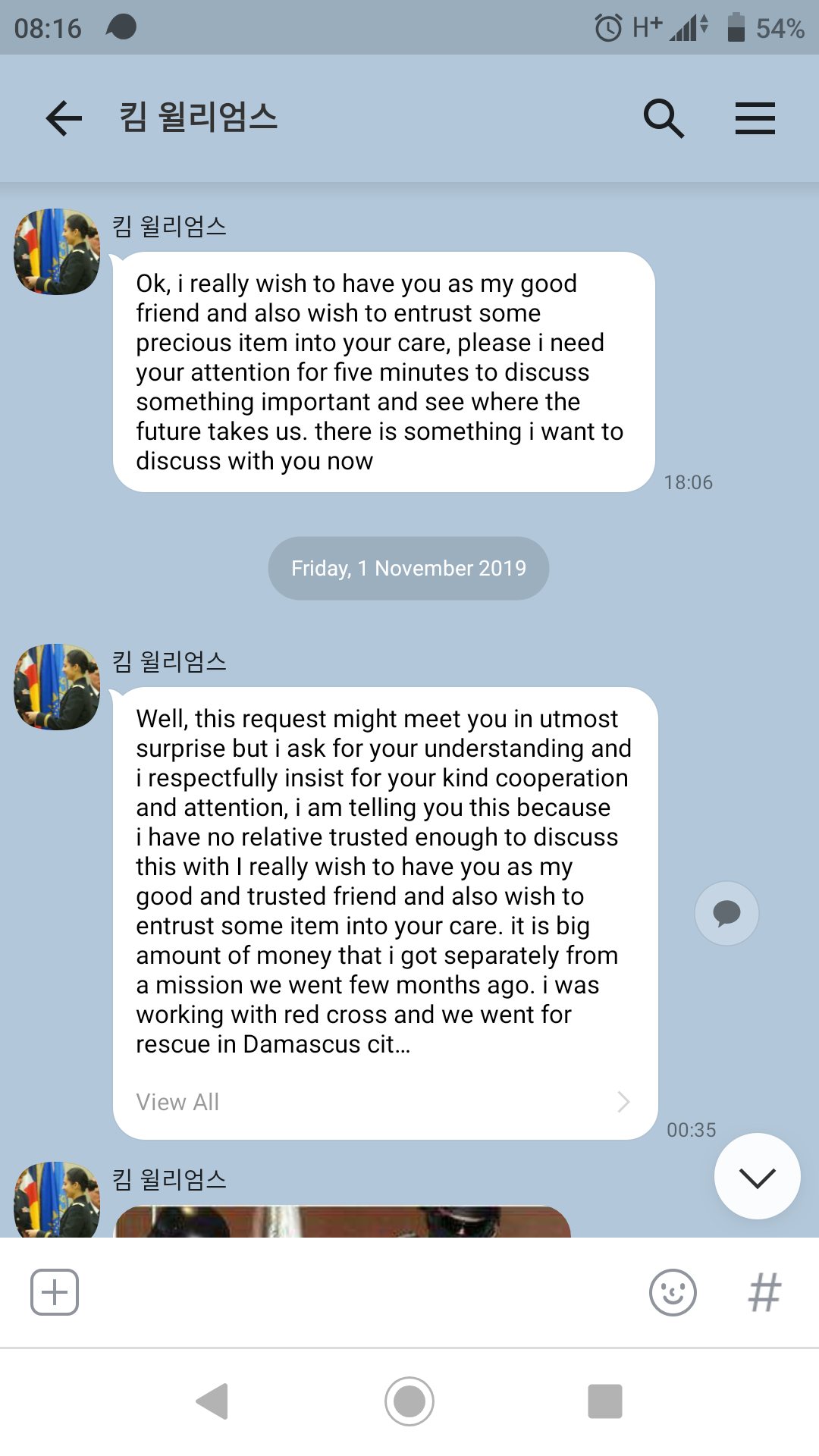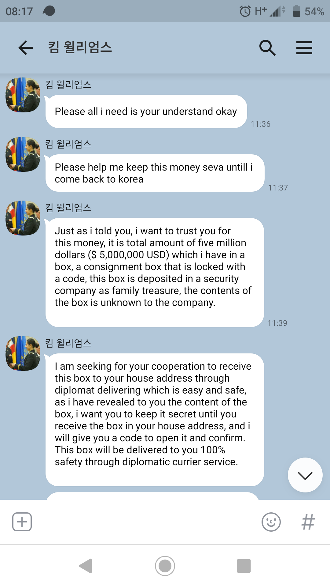 스캠많은 21세기에 오신 것을 환영합니다. 뉴스기사에서만 보던 로맨스 스캠. 저에게도 오는군요. 경로는 카카오톡. 카카오톡명은 Kim williams 카카오톡 ID : 7775kim 일단 새로운 친구가 생겼으니 대답은 해주어..