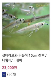 주니멀을 둘러보다 사고싶지만 꾹 참았던 물고기는 바로 아로와나 유어 . 7cm 정도의 작은 아로와나 한마리가 어항속에 들어있는데 대형 아로와나만 보다가 작은 녀석을 보니 왜이리 귀여운지 가격도 23,000원으로 저렴했습니다.