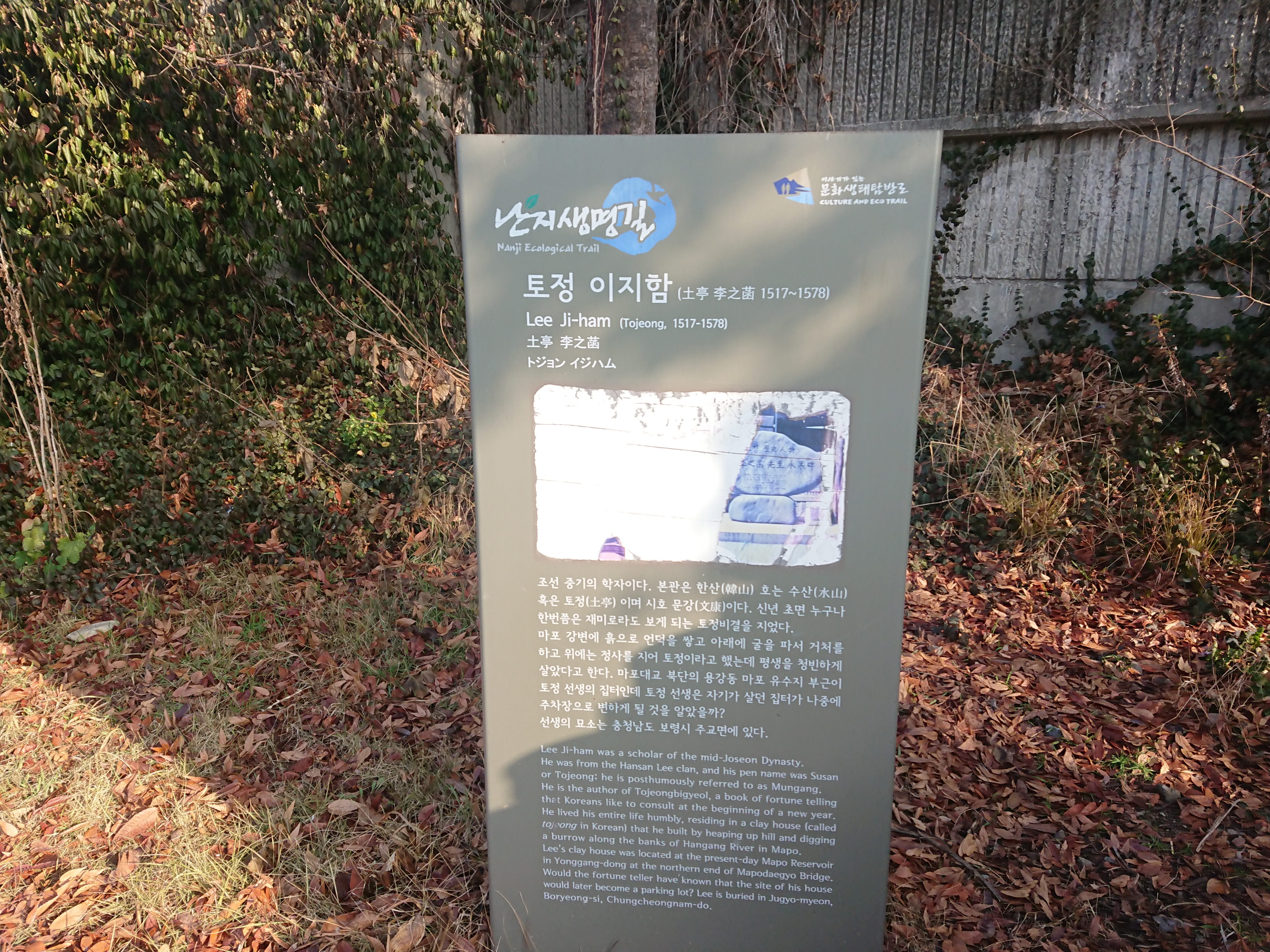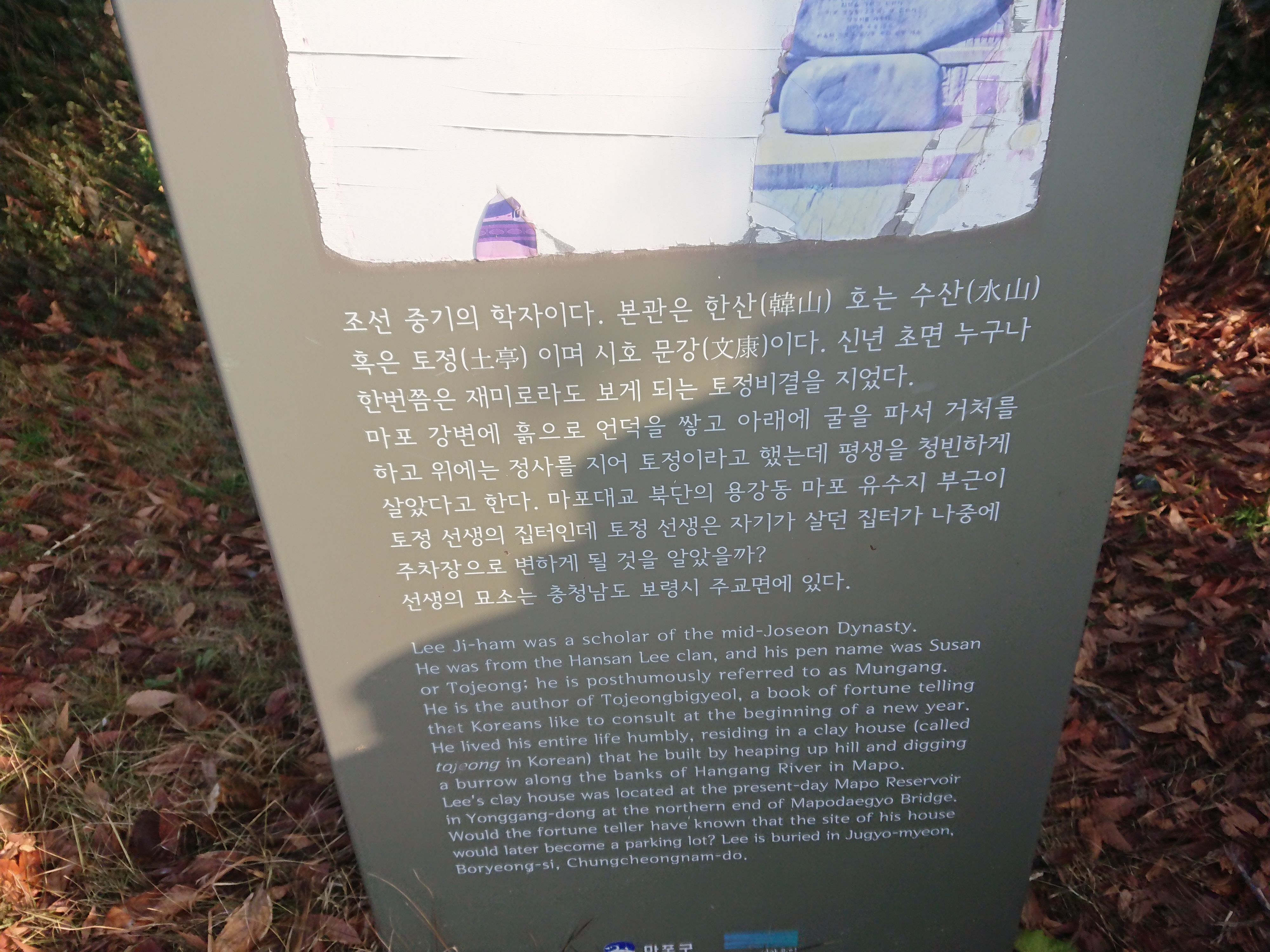 마포 삼개포구터 옆에 있는 토정 이지함 선생님에 대한 현판.