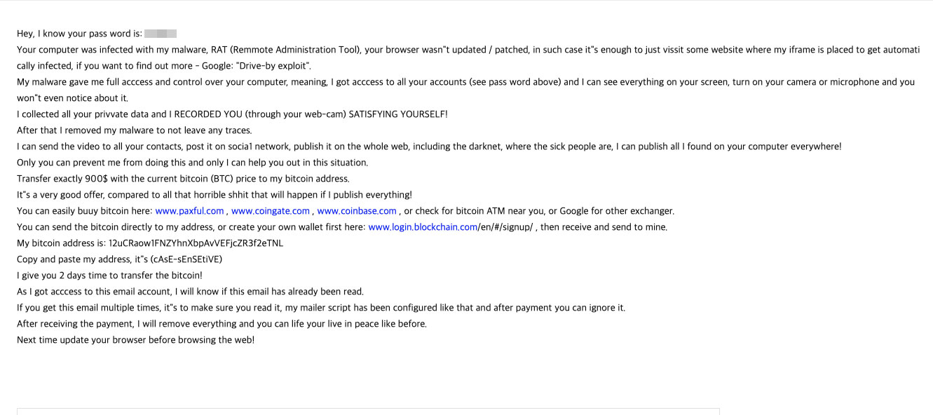 그래서 요구사항은 900$의 상당의 비트코인을 자신의 비트코인 계좌로 입금하면 2일의 시간을 줄테니 입금할 것이며 난 지금 이 메일의 계정에 접근할 수 있어 당신이 이메일을 읽었다는 것은 확인할 수 있으니 빠져나갈 구멍이 없다.