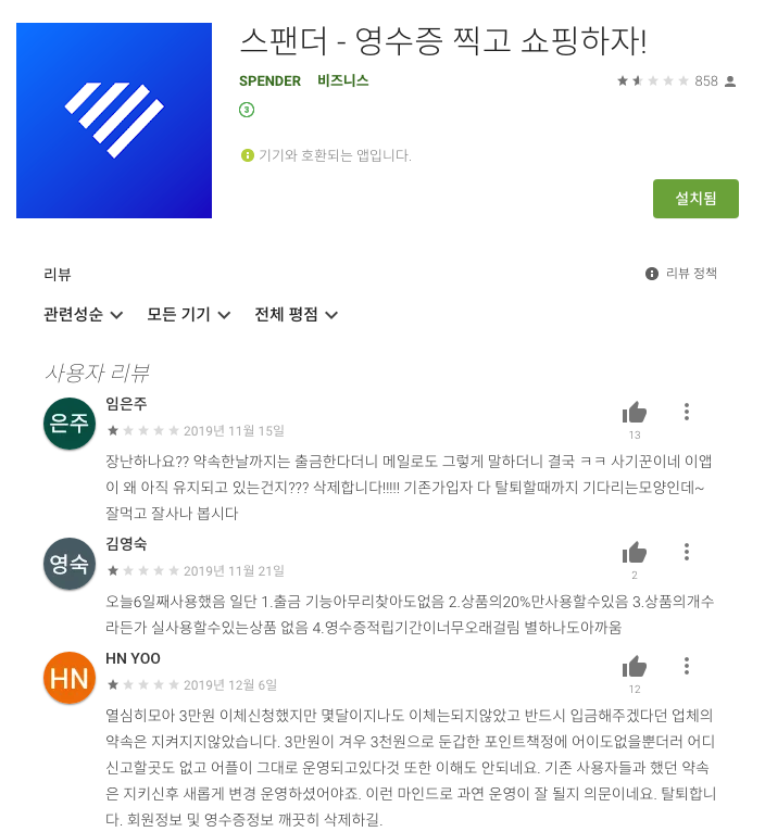 영수증 찍어서 올려서 현금을 적립하는 스펜더 앱의 정책에 변경이 있어 유저들간에 혼란이 있어보입니다.