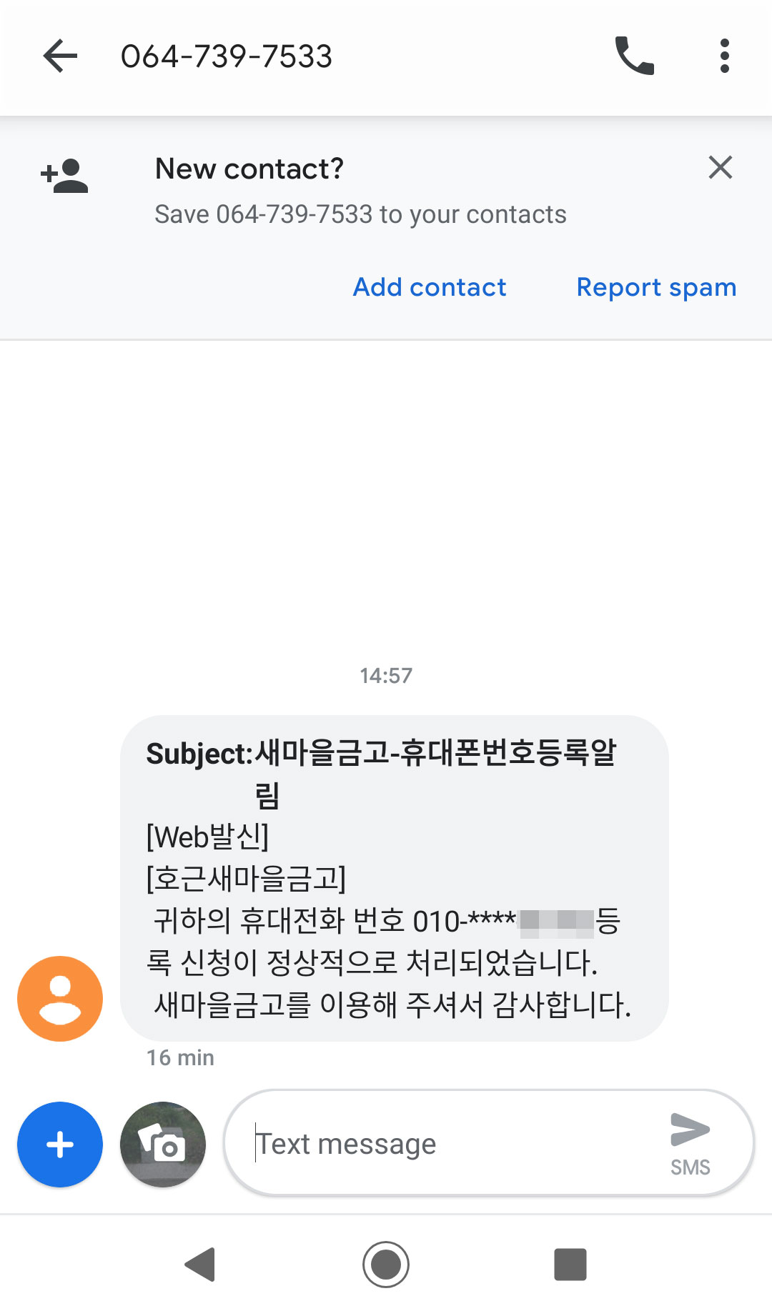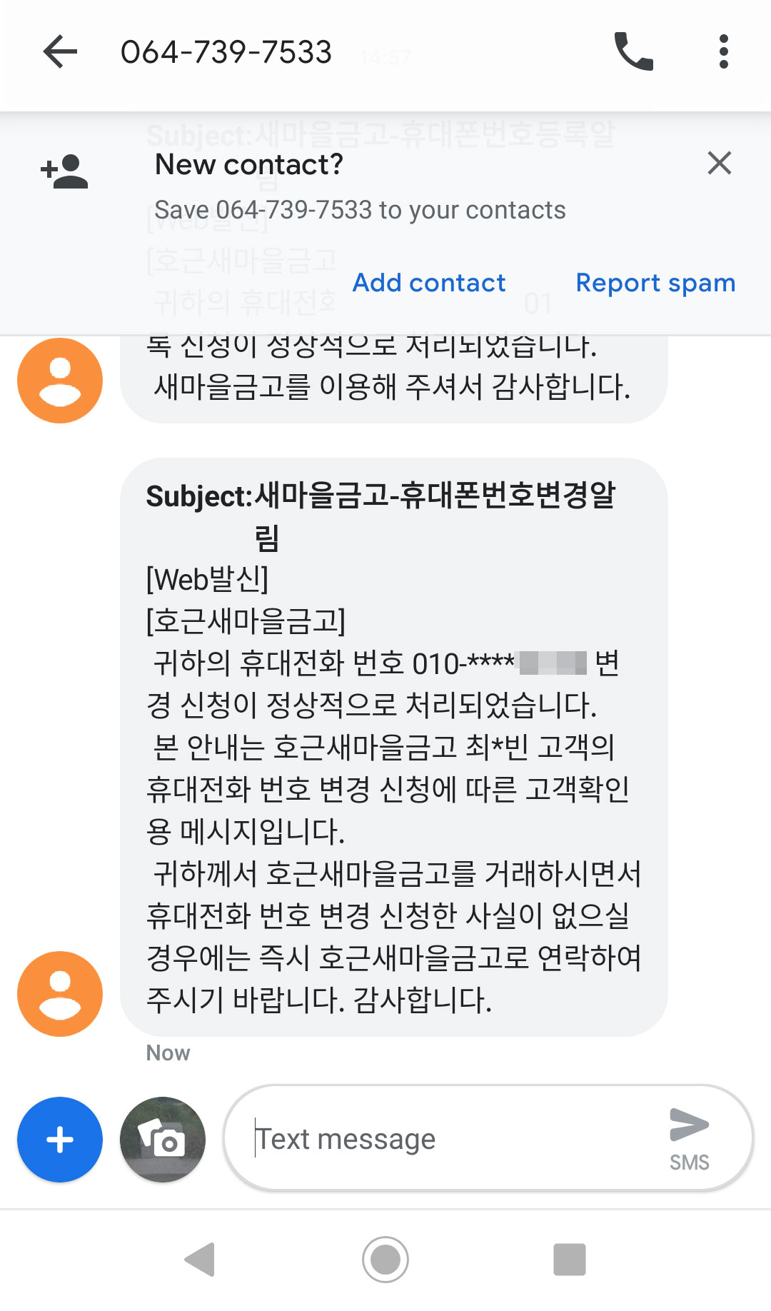 호근새마을금고에 내 휴대전화번호가 등록되었다는 문자메세지가 왔다.