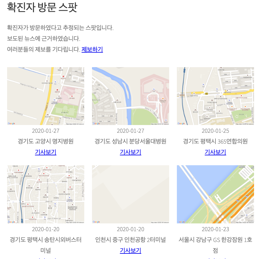 코로맵 사이트가 오픈하였습니다. 운영자 신종 코로나바이러스의 추가 확산 방지를 위해 정보를 공유하고자 합니다. 여러분들의 제보를 기다립니다.