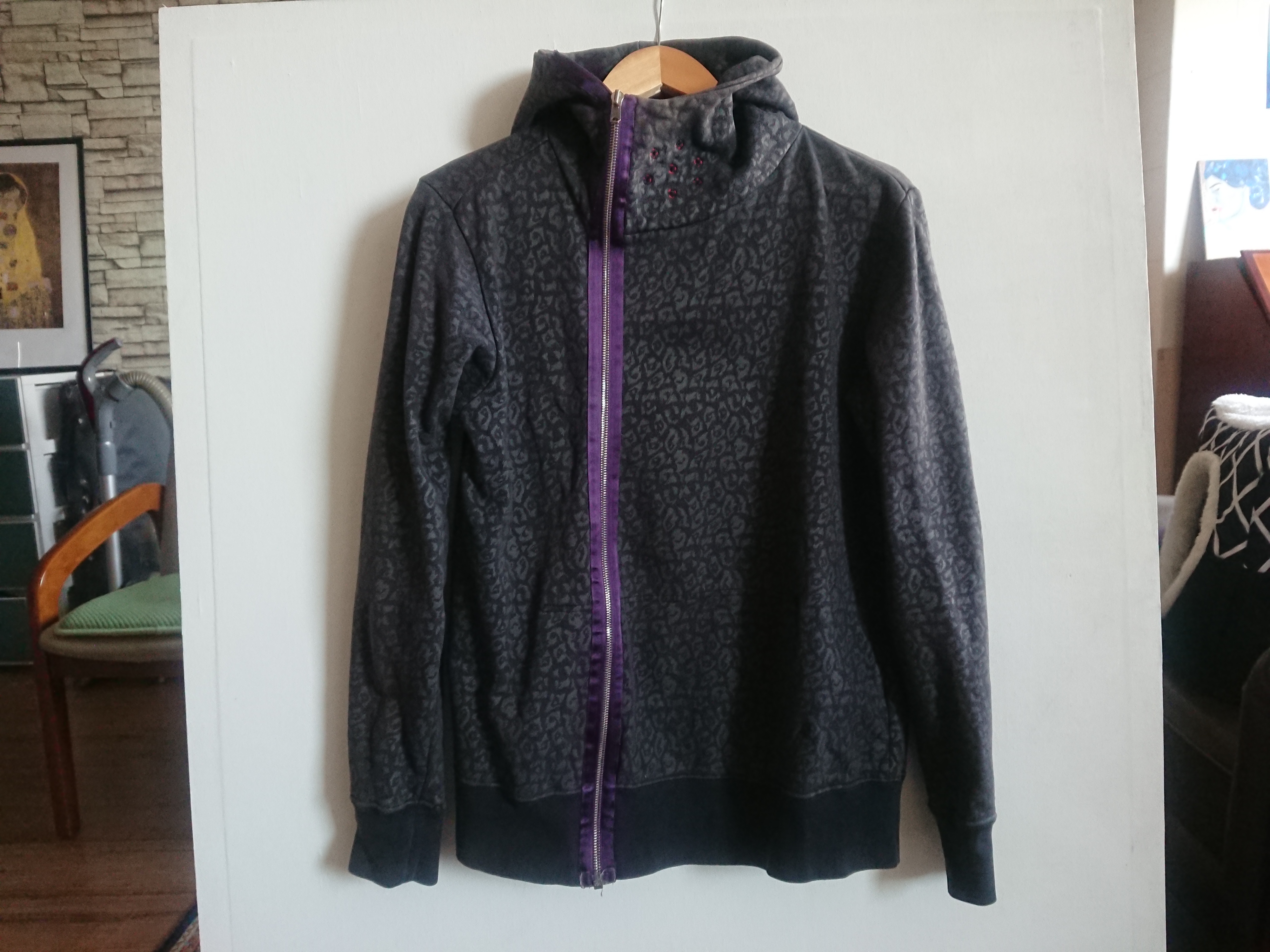 레오파드 패턴의 블랙후디이며 보라색 실크지퍼로 장식되어있습니다.