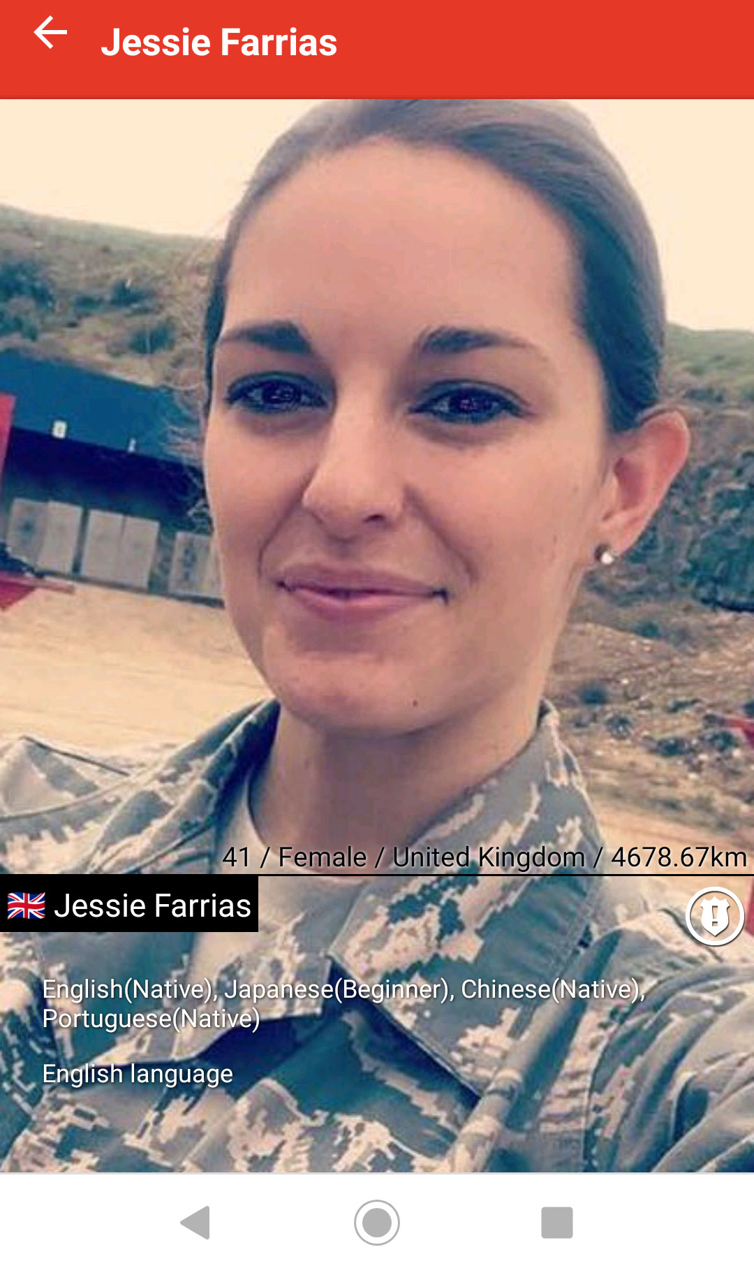 자신은 킴 윌리엄스이며 한국인 어머니를 두고 있으며 아버지는 미국 캘리포니아 출신, 부모님은 자신이 8살일때 자동차 사고로 돌아가셨으며 자신이 유일한 생존자라는 가족사까지 친구등록 10분이 안되 모두 알려줍니다. 가족도 친척도 없으며 그때문에 군인이 되었다고 합니다.