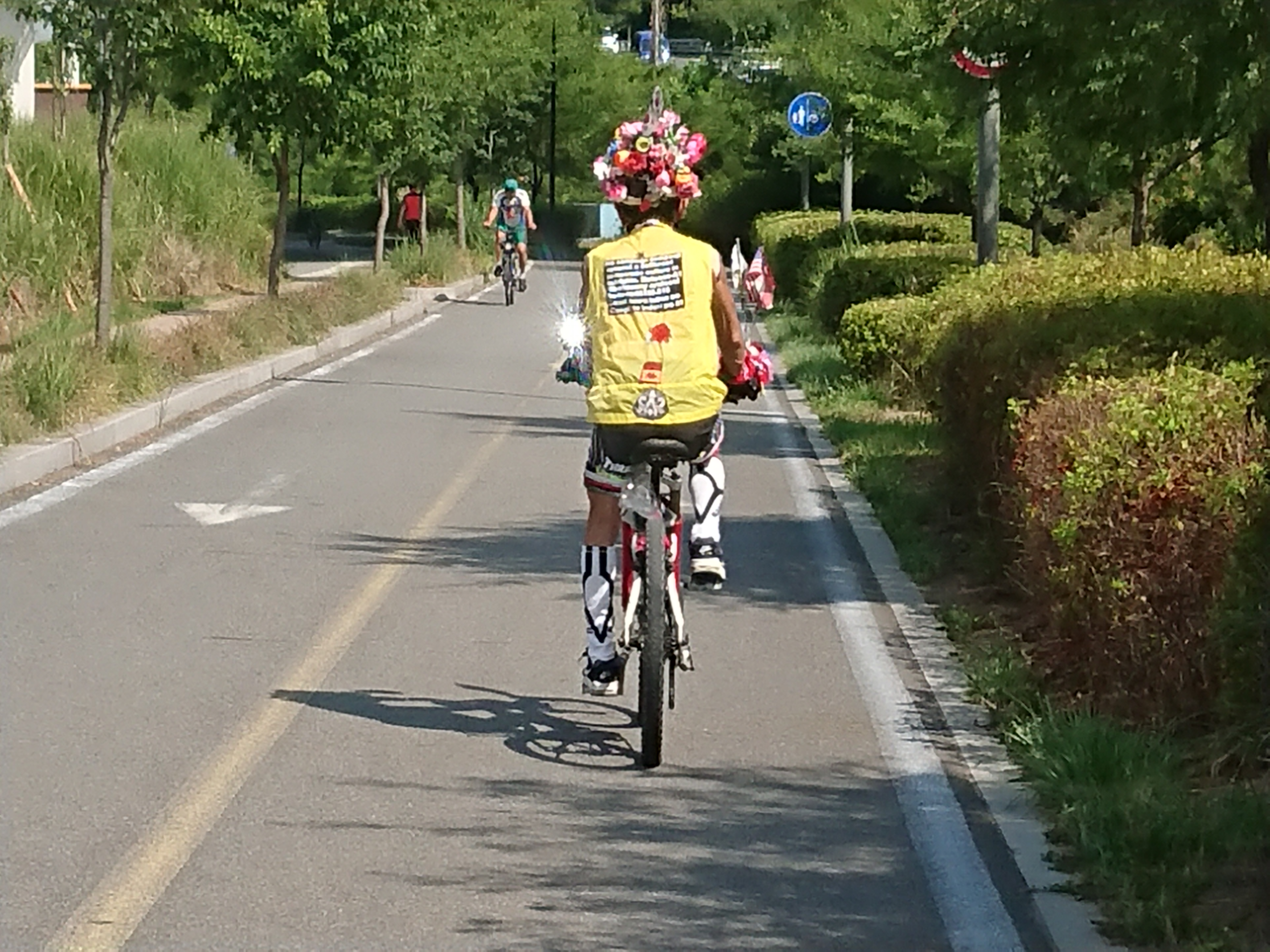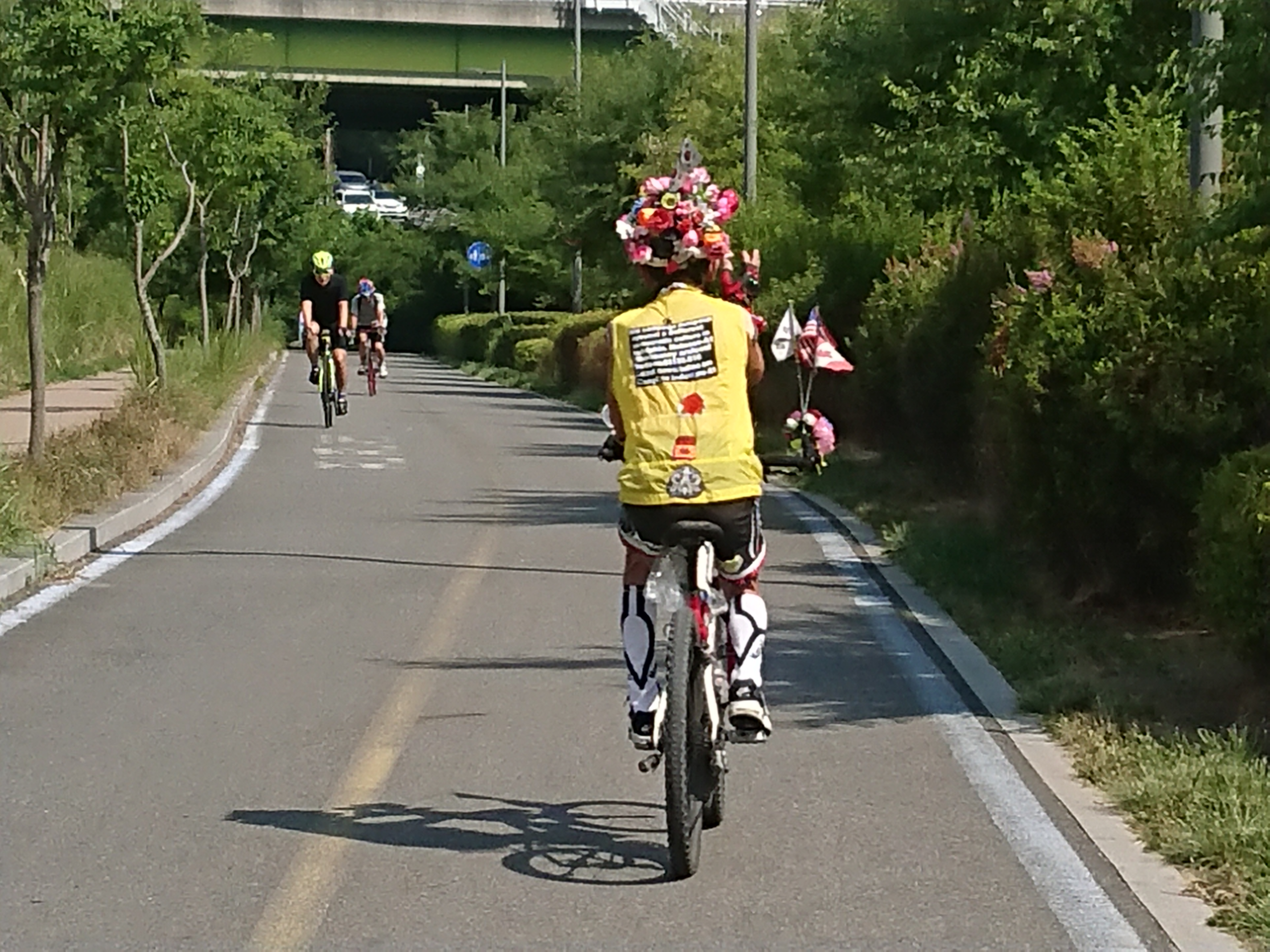 상수 나들목쪽에 등장하신 머리에 꽃단 자전거 아저씨.