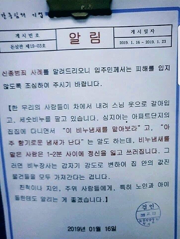 '한 무리의 사람들이 차에서 내려 스님 옷으로 갈아입고, 세숫비누를 팔고 있습니다. 심지어는 아파트 단지의 집집에 다니면서 " 이 비누냄새를 맡아보라"고 " 아주 향기로운 냄새가 난다"는 말도 하는데, 비누냄새를 맡은 사람은 1-2분 사이에 정신을 잃고 쓰러집니다. 그러면 비누장사는 갑자기 강도로 변하여 집 안의 값진 물건들을 모두 가져단가는 겁니다. 친척이나 지인, 주위 사람들에게, 특히 노인과 아이들한테도 할리는게 좋게습니다" 2019년 1월16일