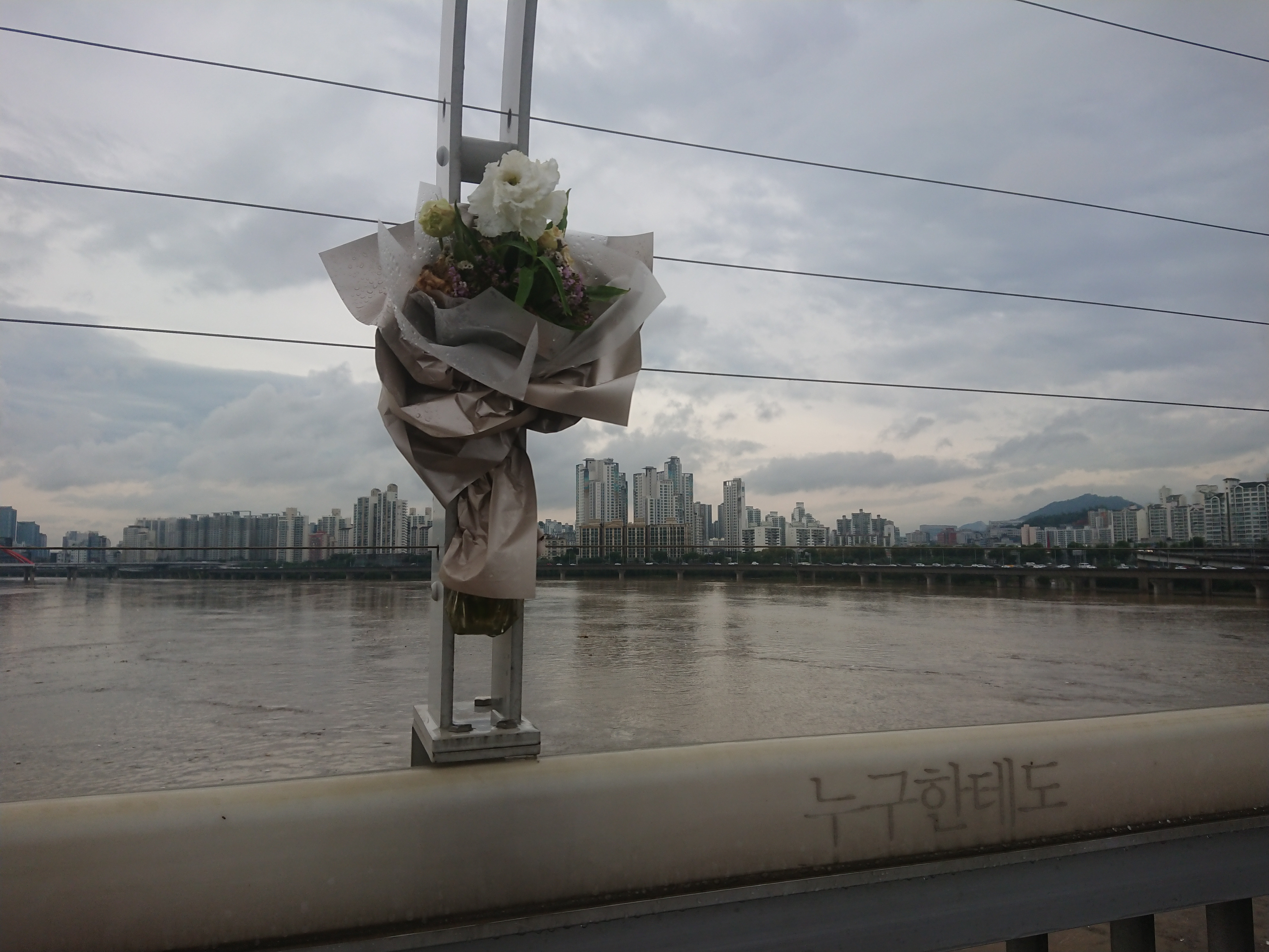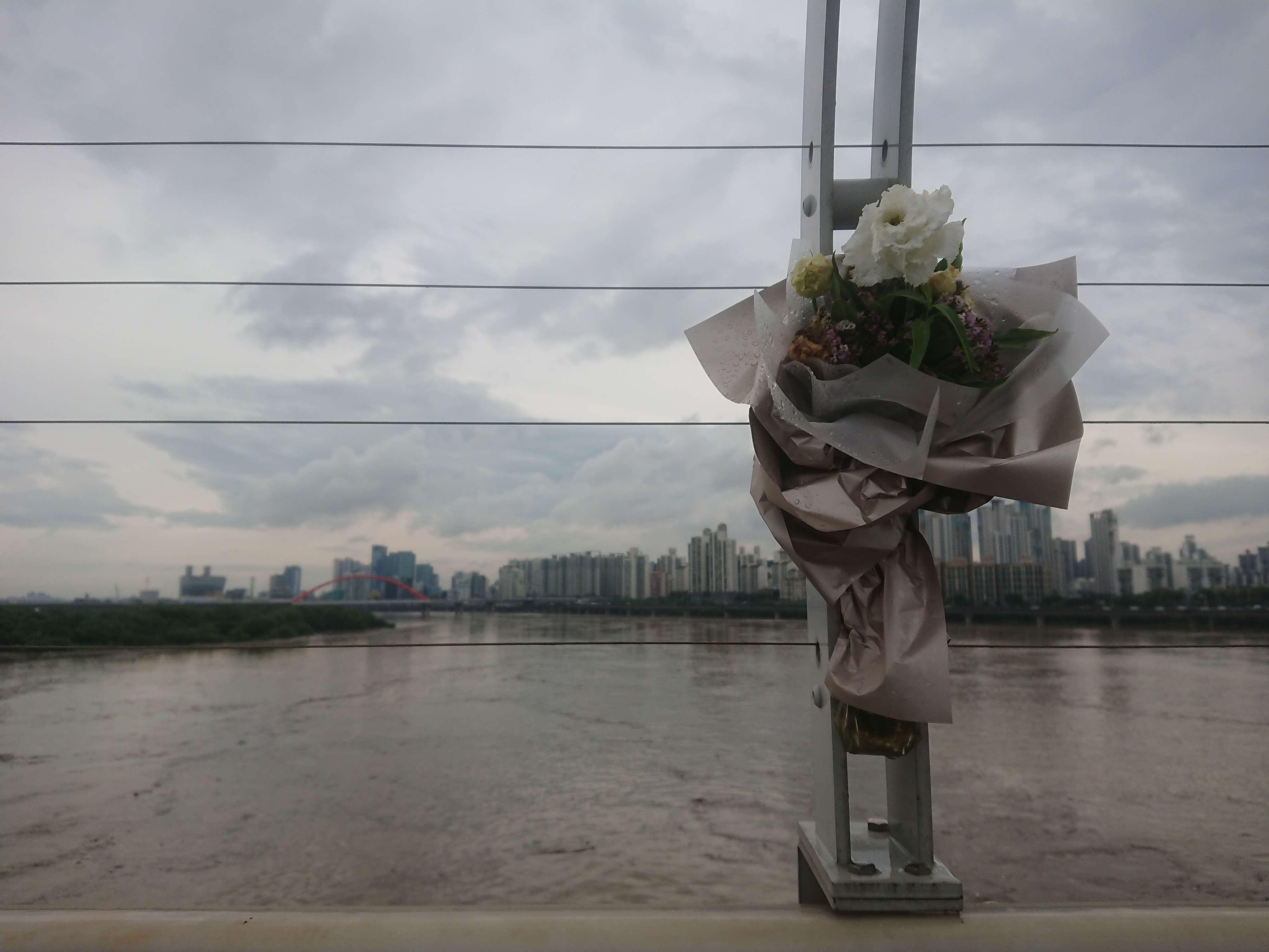 마포대교를 건너던 중 발견한 꽃다발.