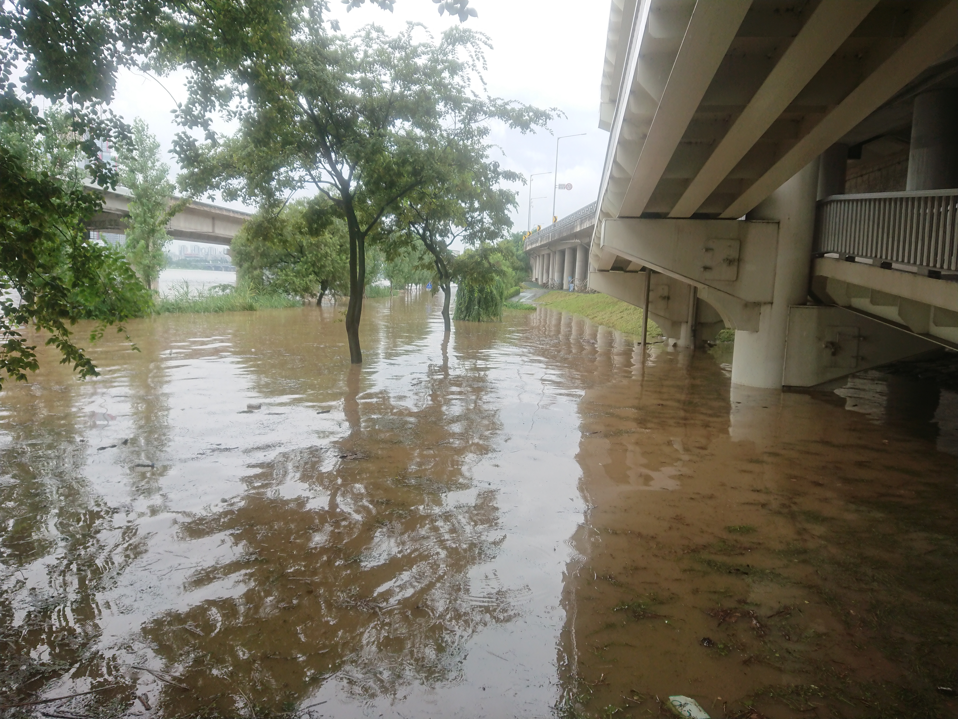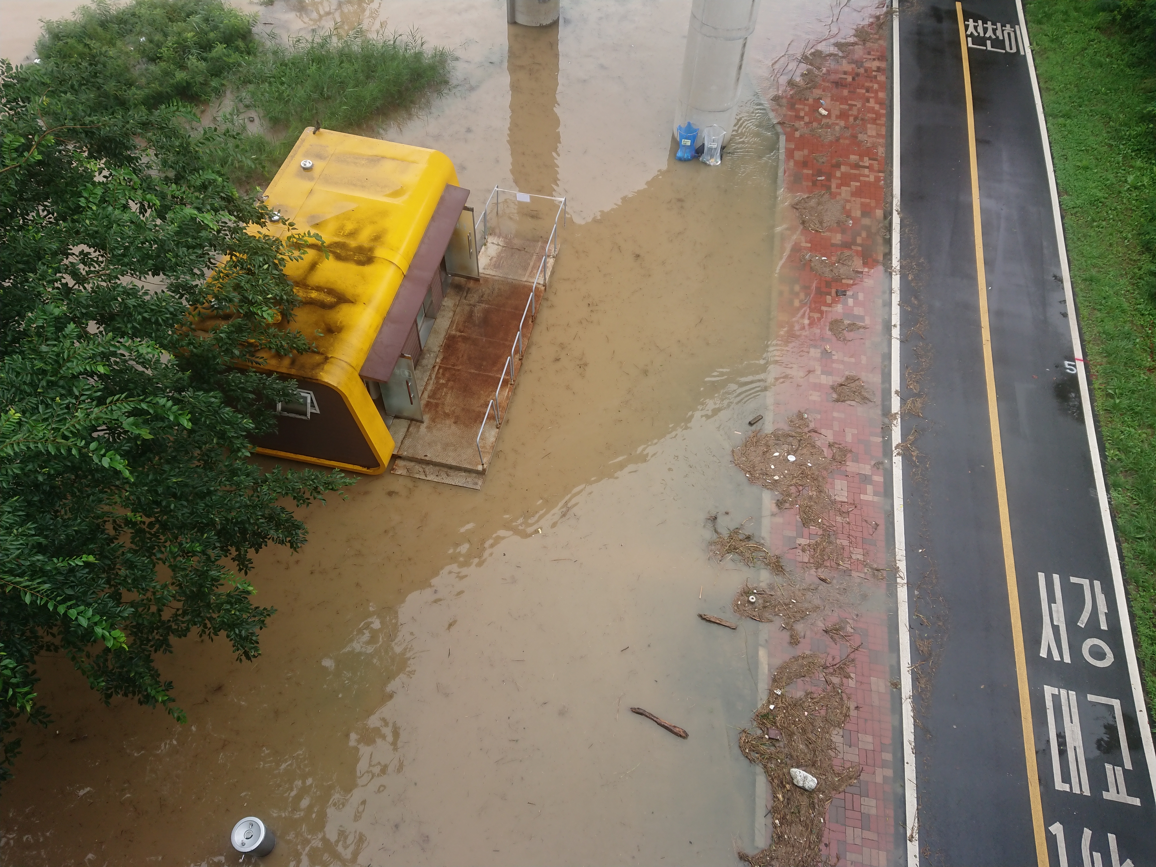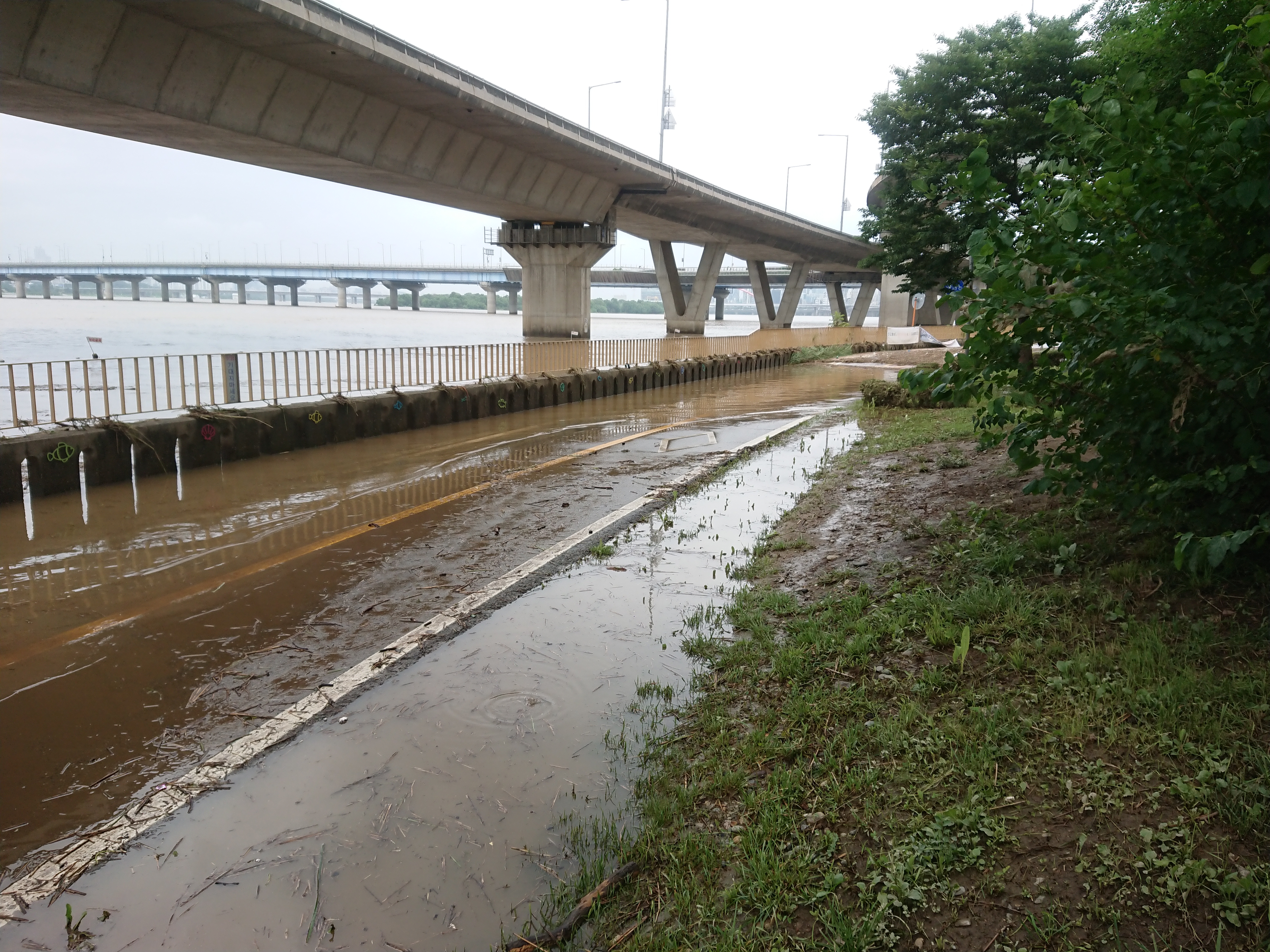 자전거 도로가 전혀 보이지 않을 정도로 물에 잠겼네요.