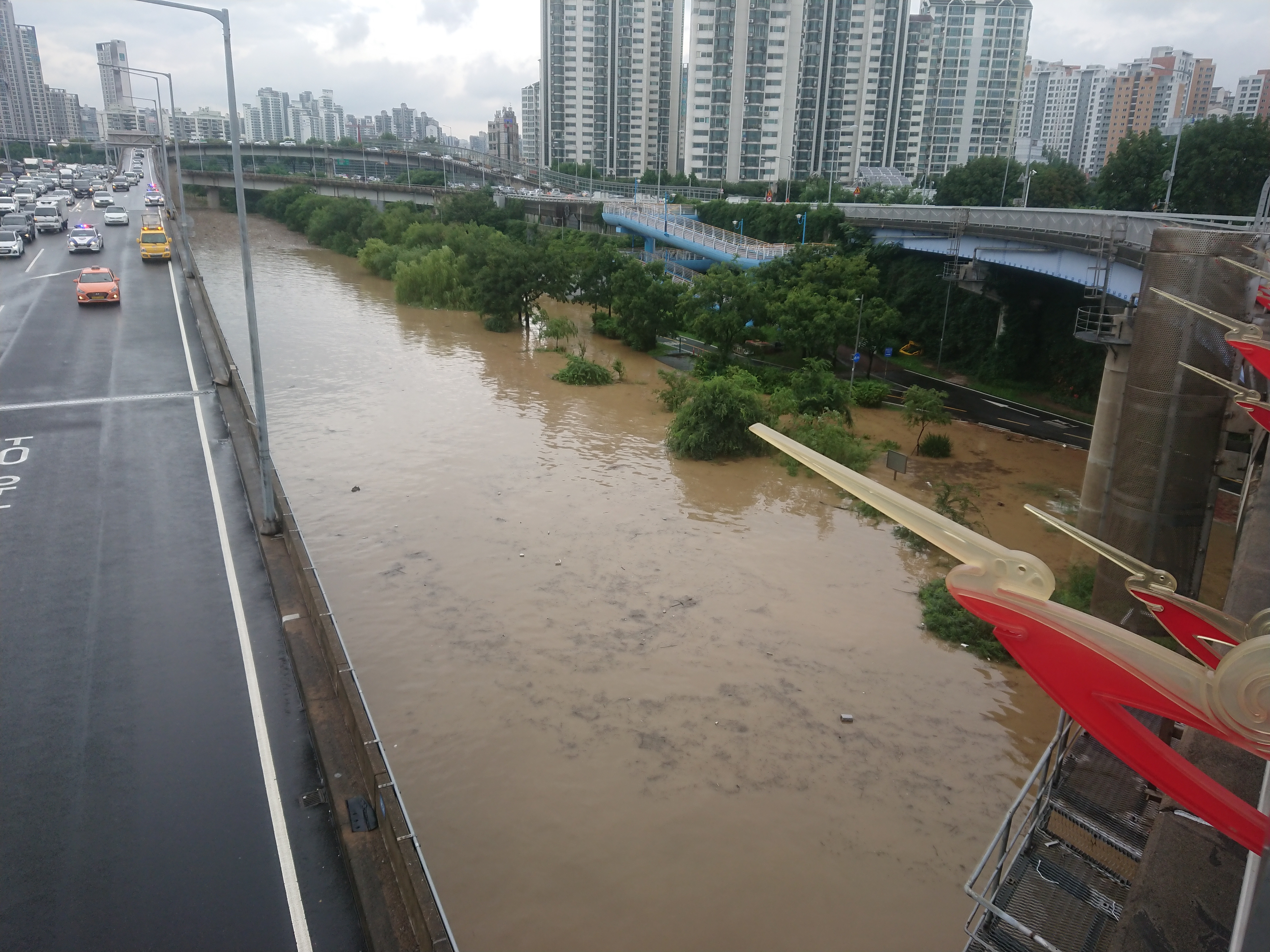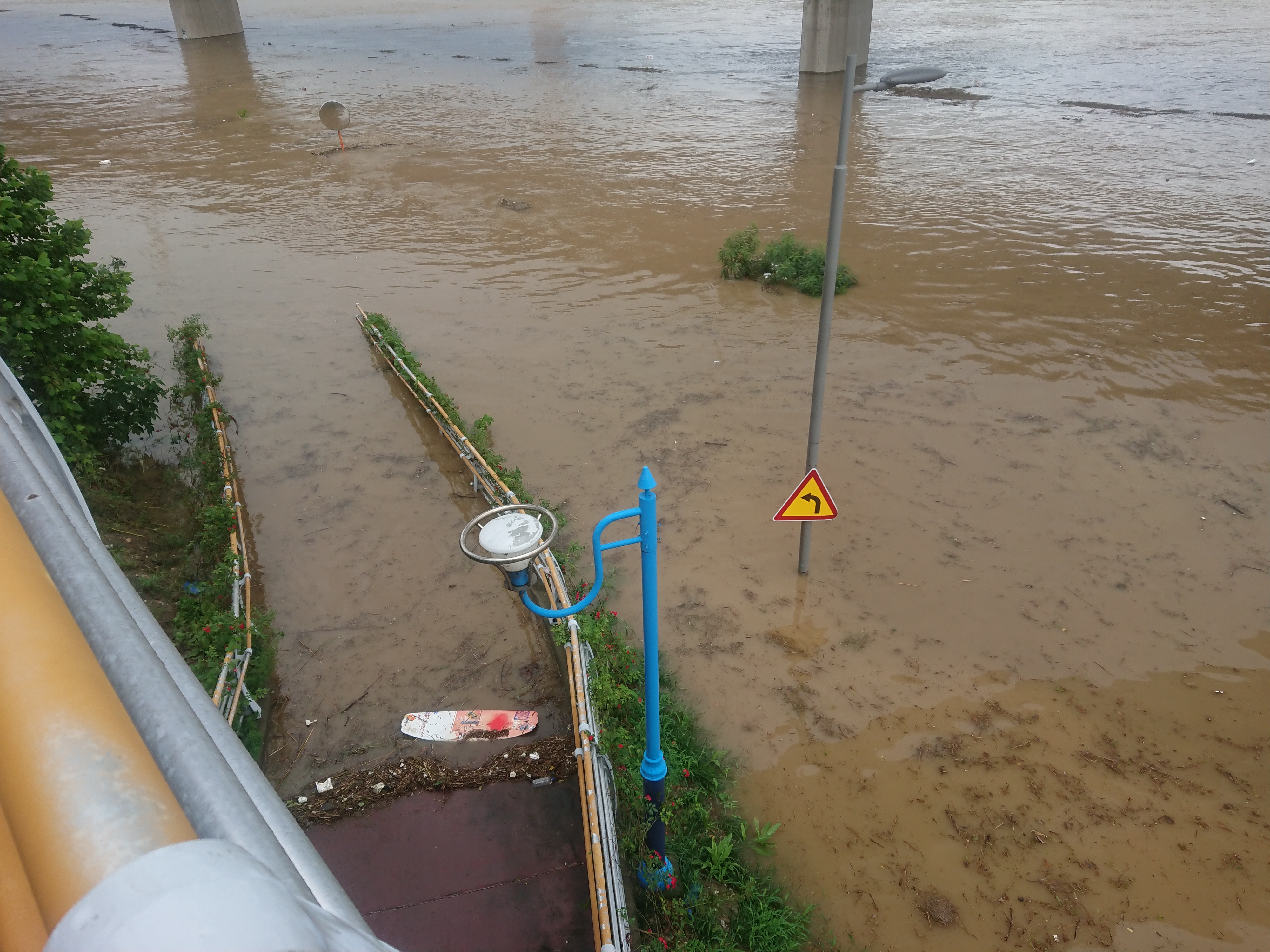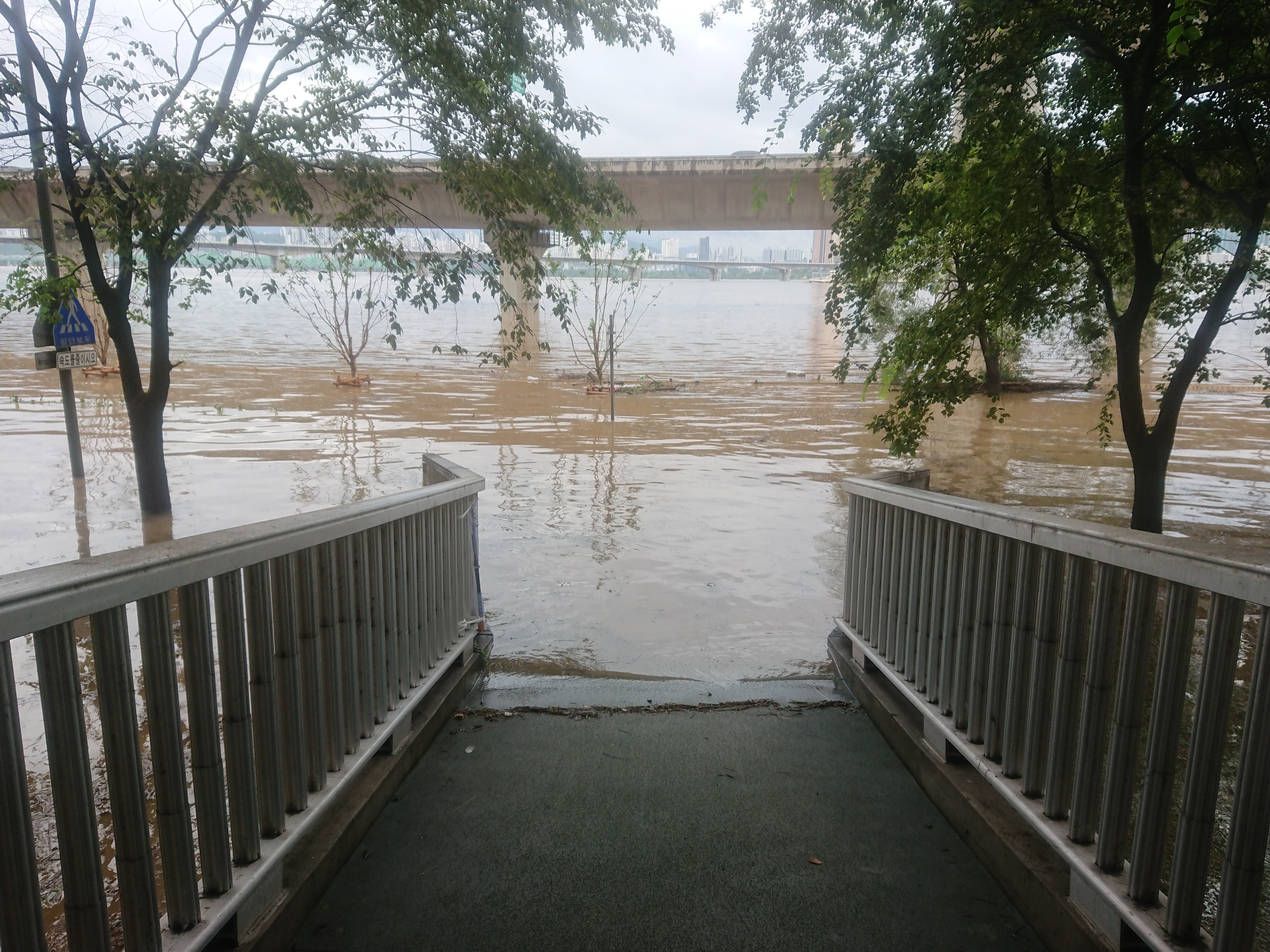 자전거 도로가 전혀 보이지 않을 정도로 물에 잠겼네요.