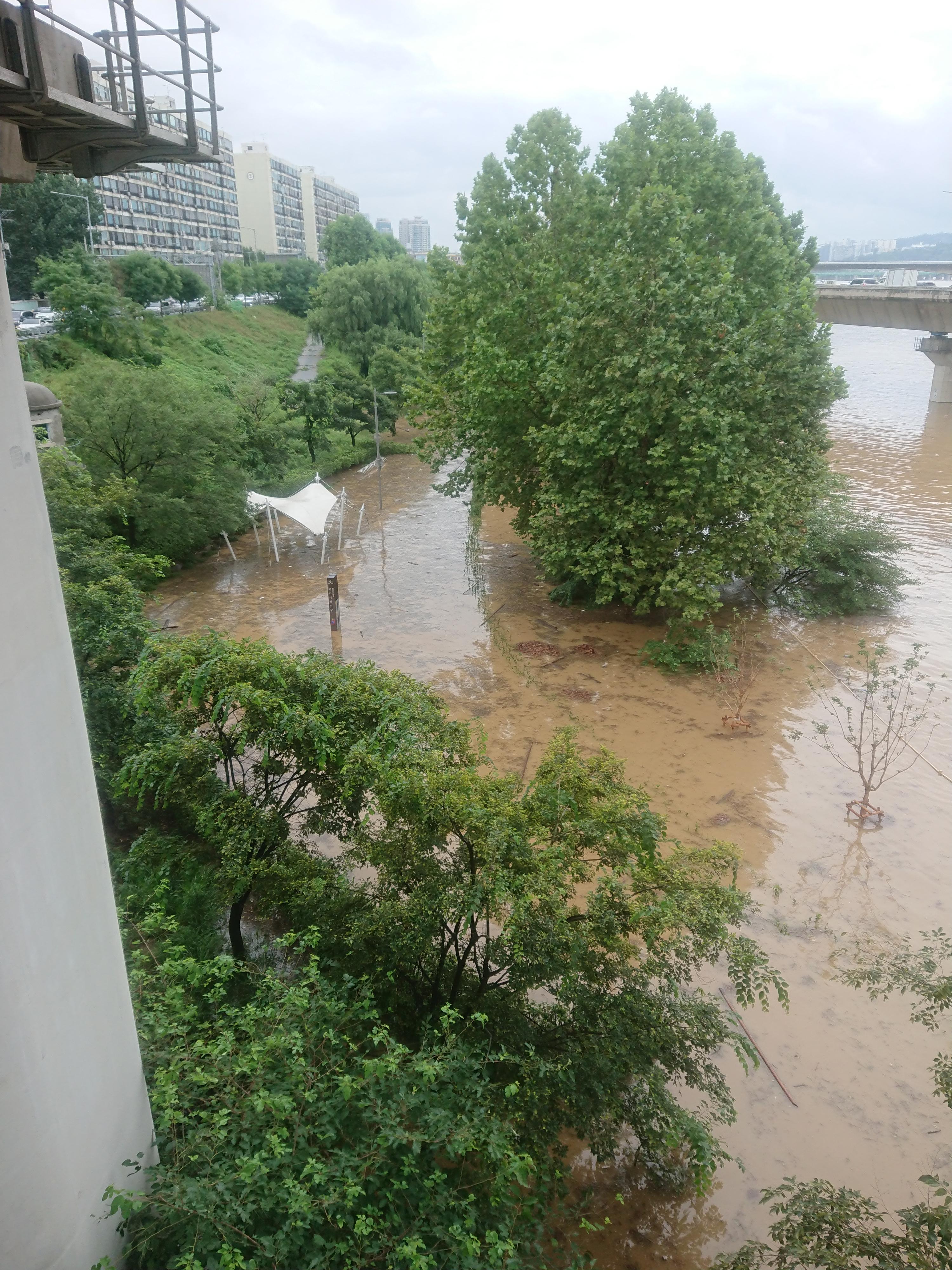 하얀 캐노피는 벤치가 있던 자리인데 흔적도 없이 물에 잠겨버렸네요.