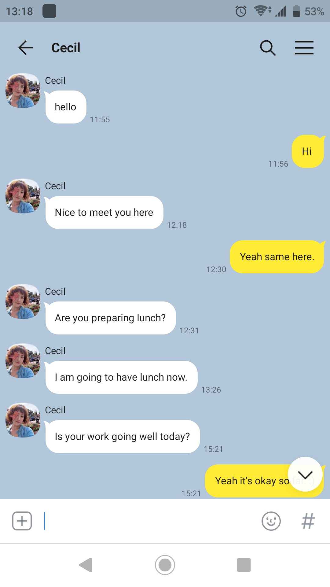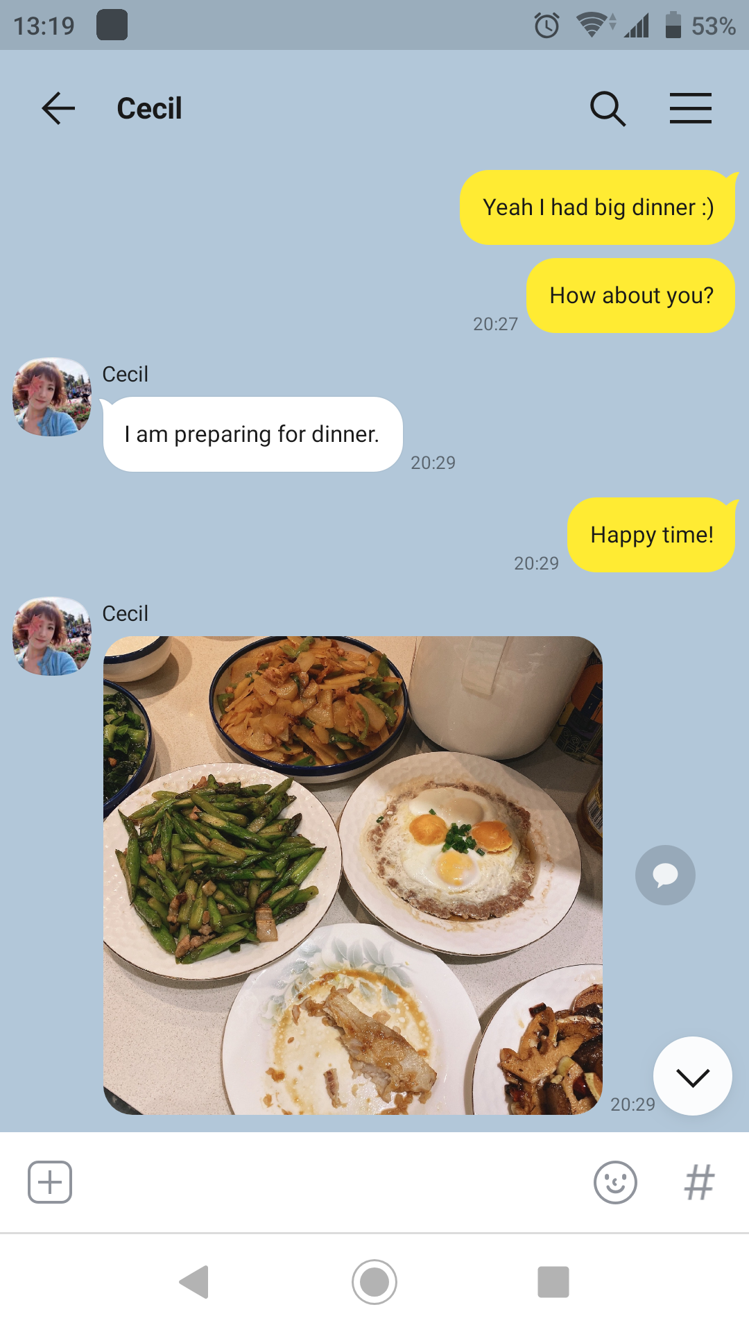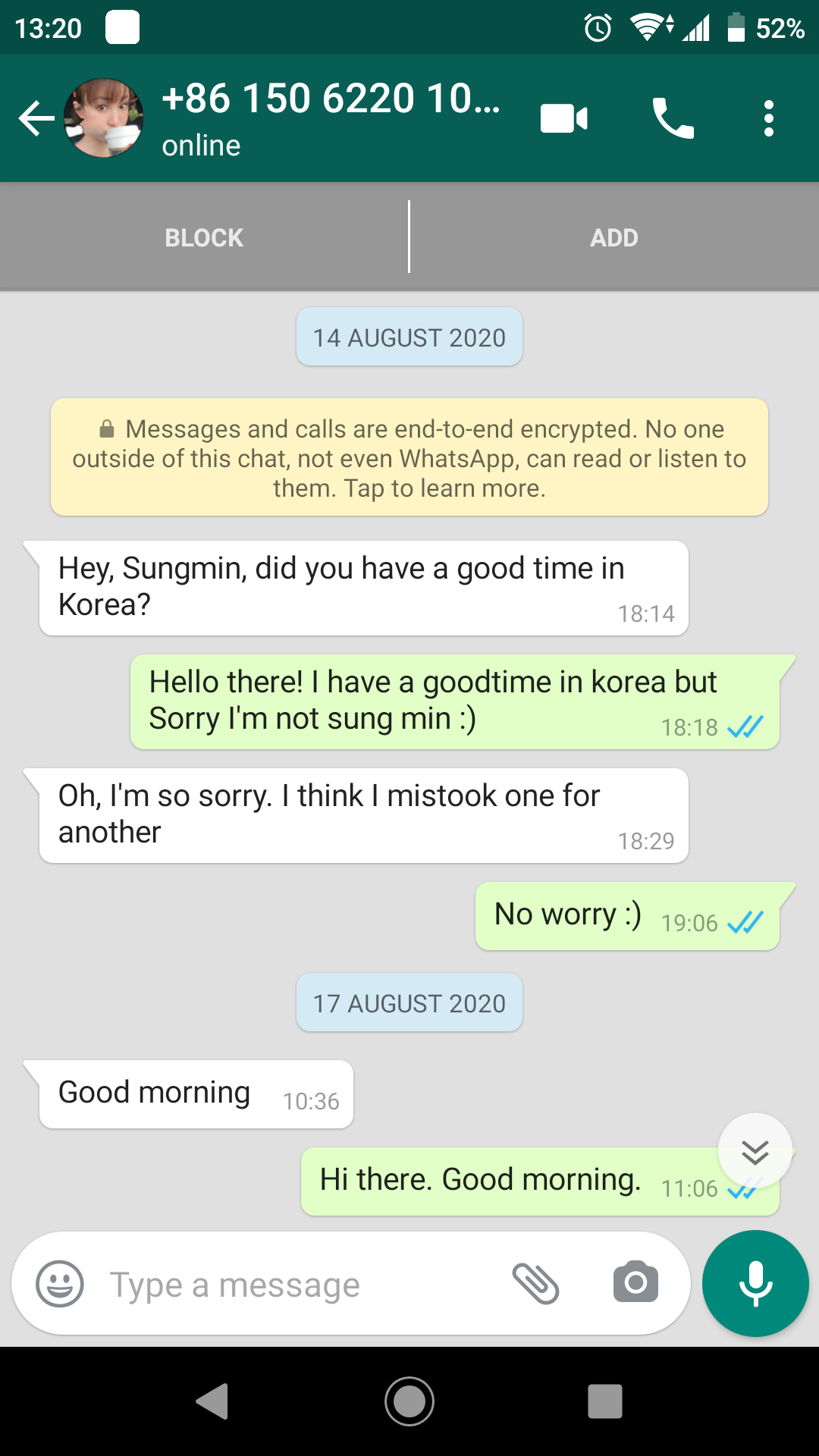 중국에서 뷰티 살롱을 운영하고 있고 일끝나면 요가 클래스를 간다는 등 중간중간 일상 사진을 보내오는 등 매우 빠르게 친해지려 합니다.