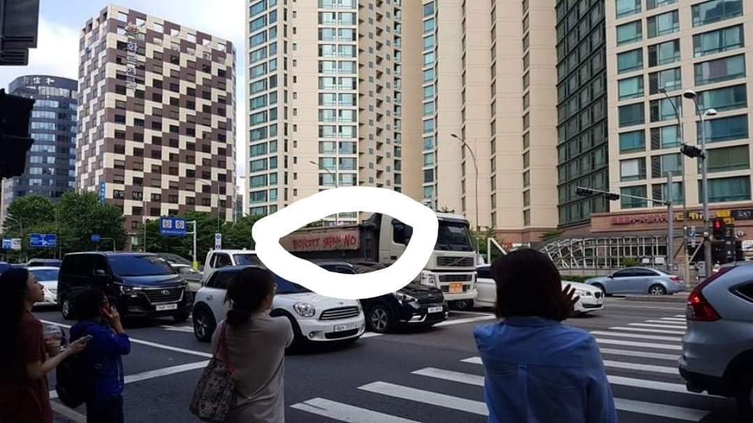 트럭측면에 빨강 스프레이로 BOYCOTT JAPAN NO 라고 적혀있네요.